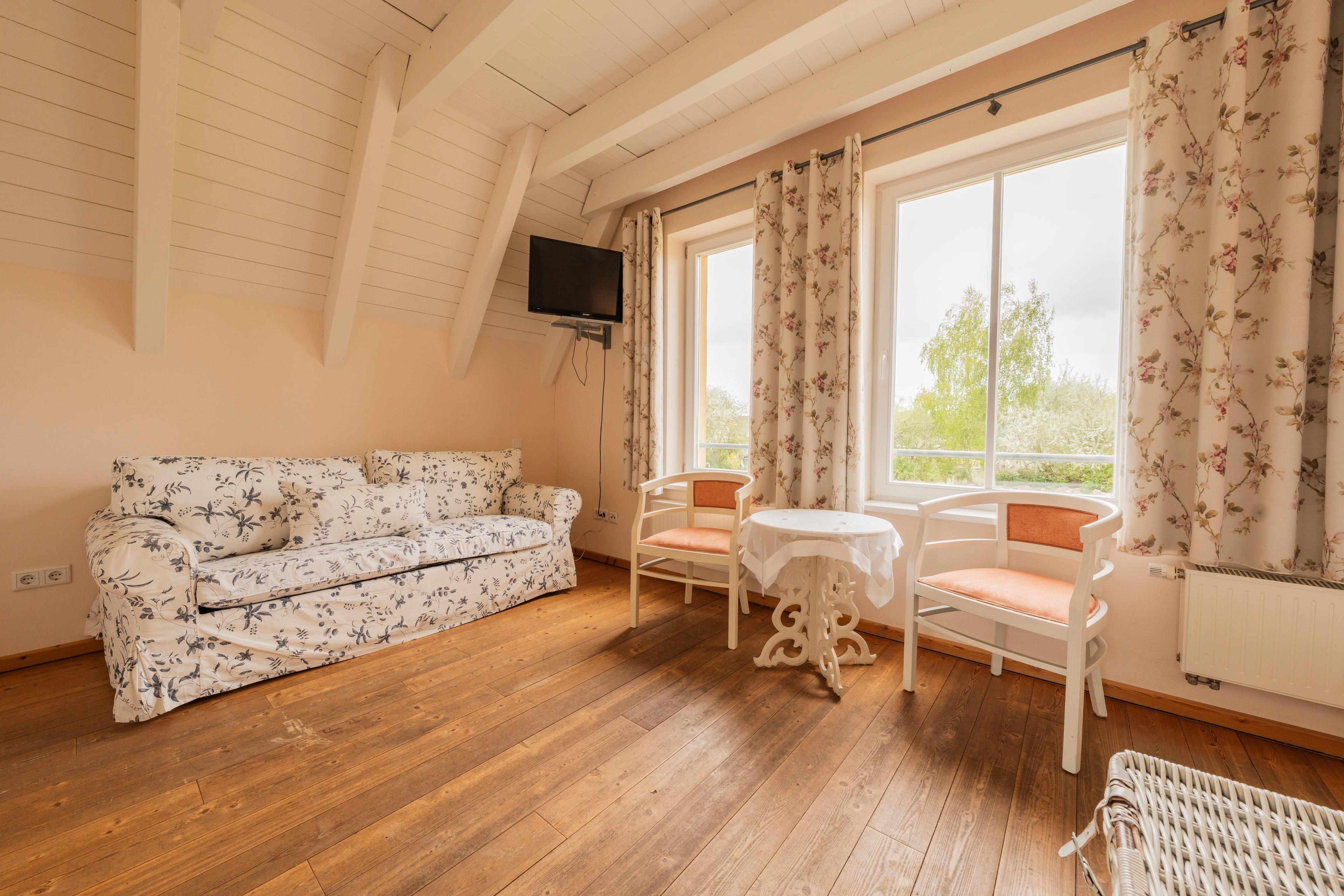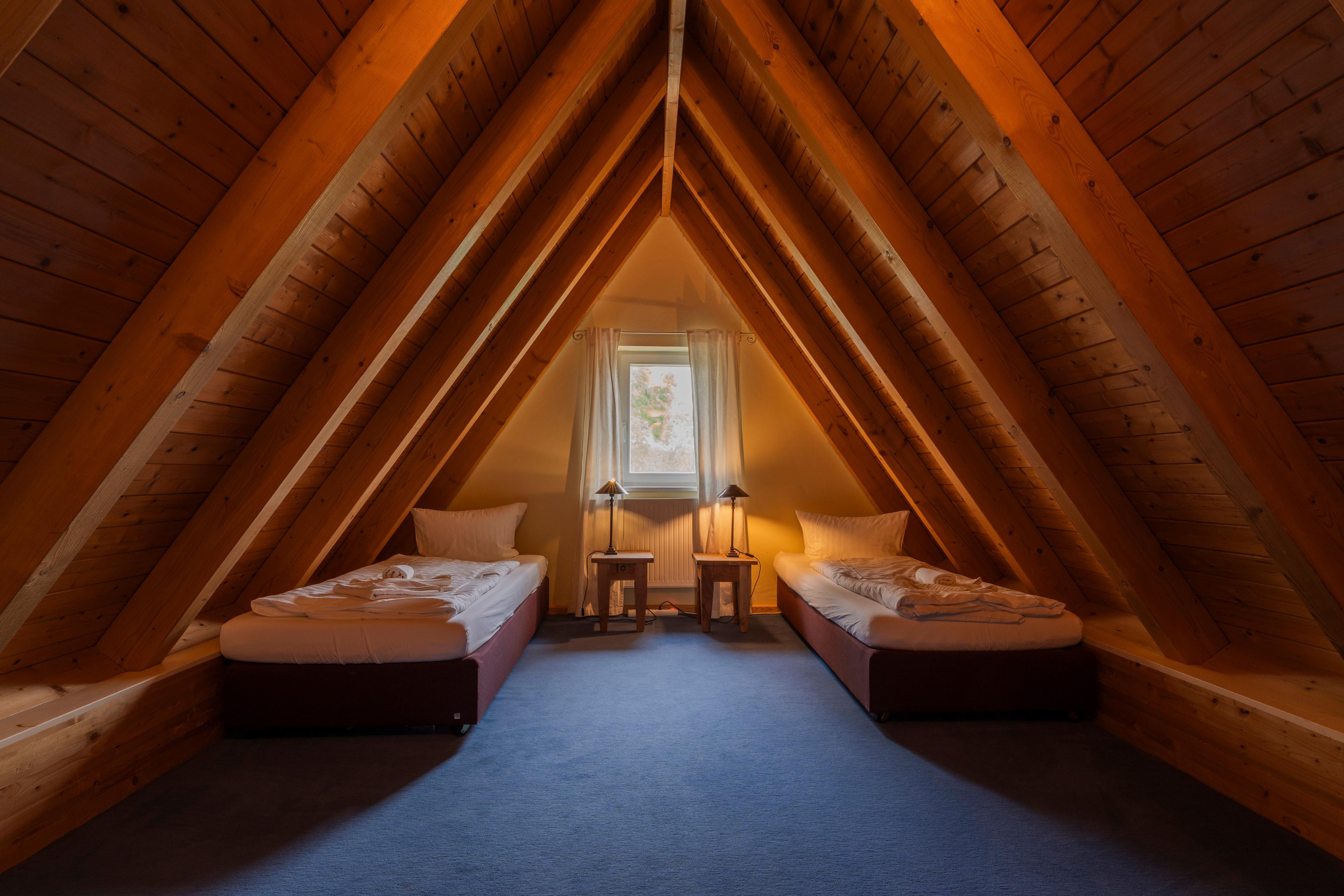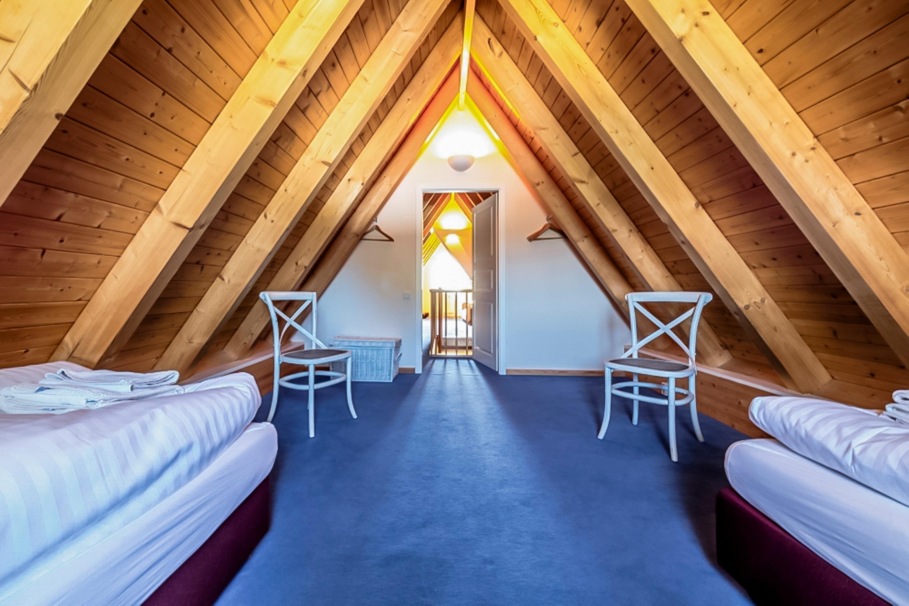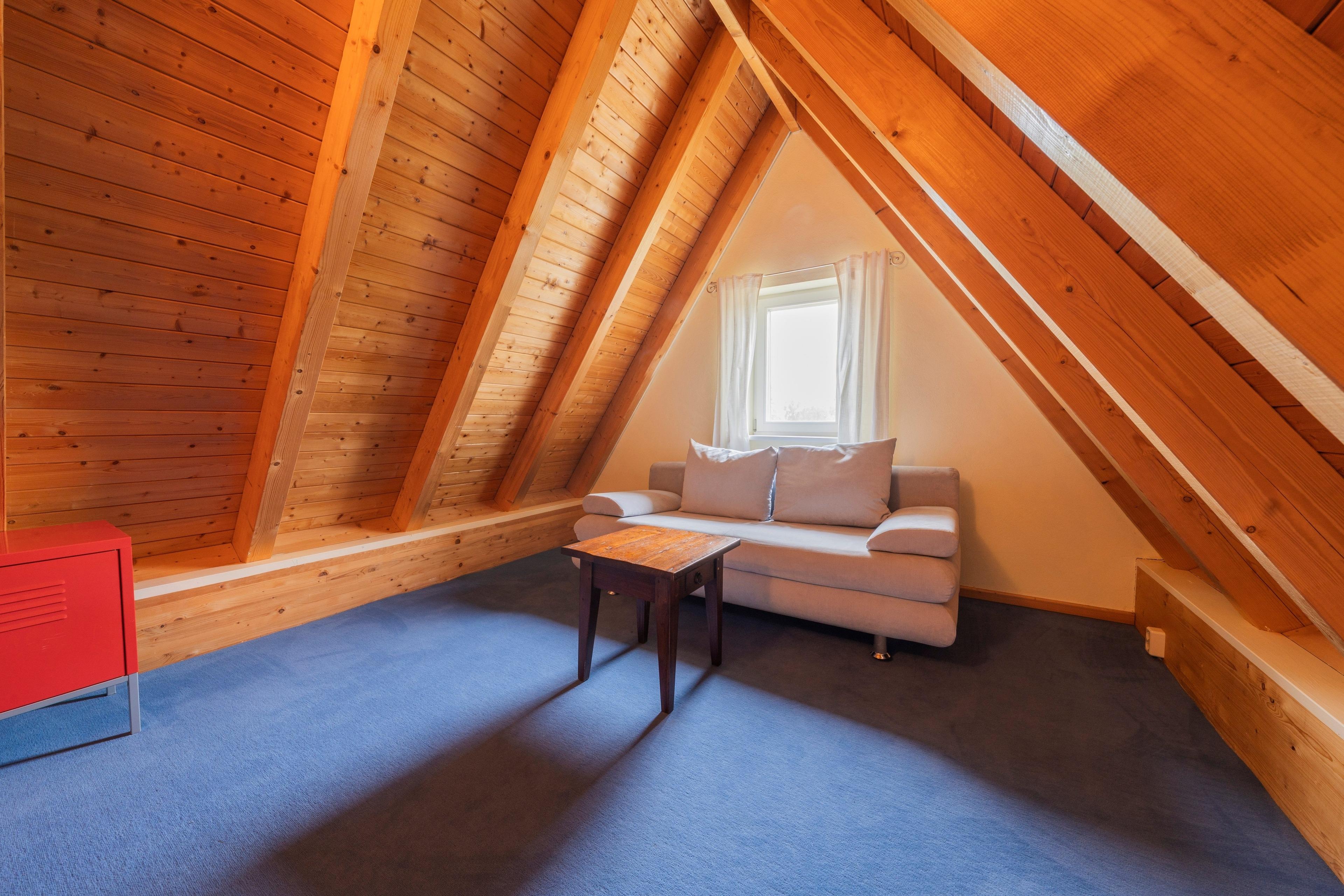 Spitzboden: Zwei Einzelbetten und Schlafcouch – perfekt für zusätzliche Gäste