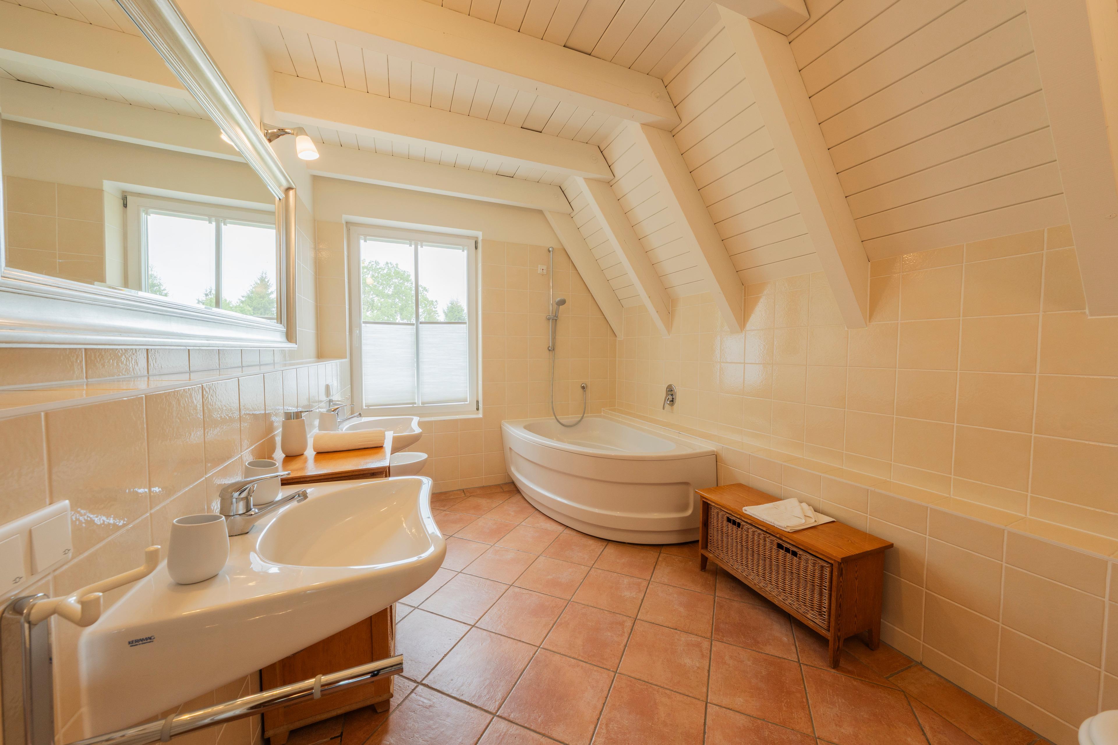 Geräumiges Badezimmer: Mit Eckbadewanne, Dusche, WC und Bidet