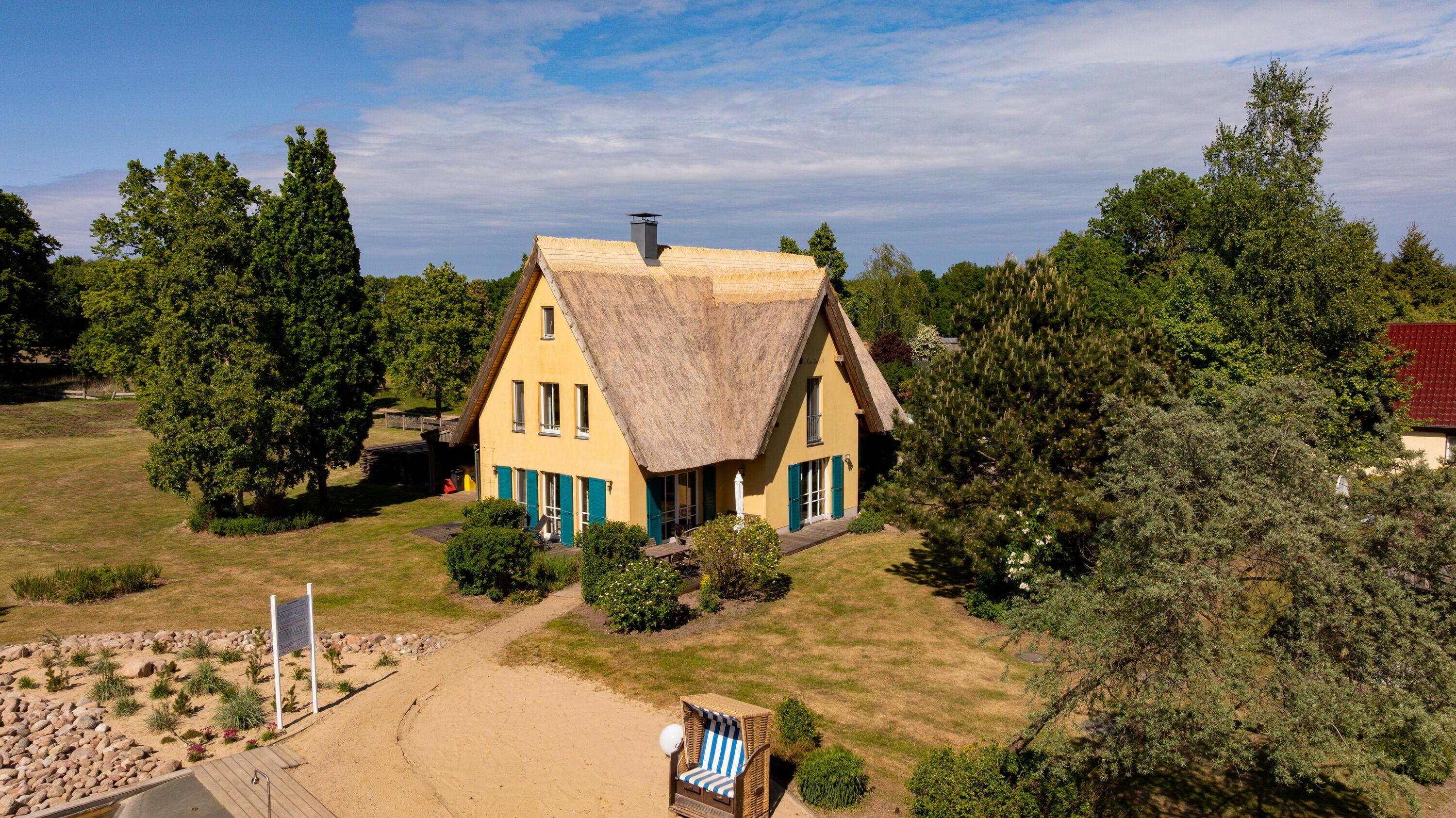 Ferienhaus Kranich – Rollstuhlgerechtes Reetdachhaus mit Schwimmteich und großer Gartenanlage in Krienke
