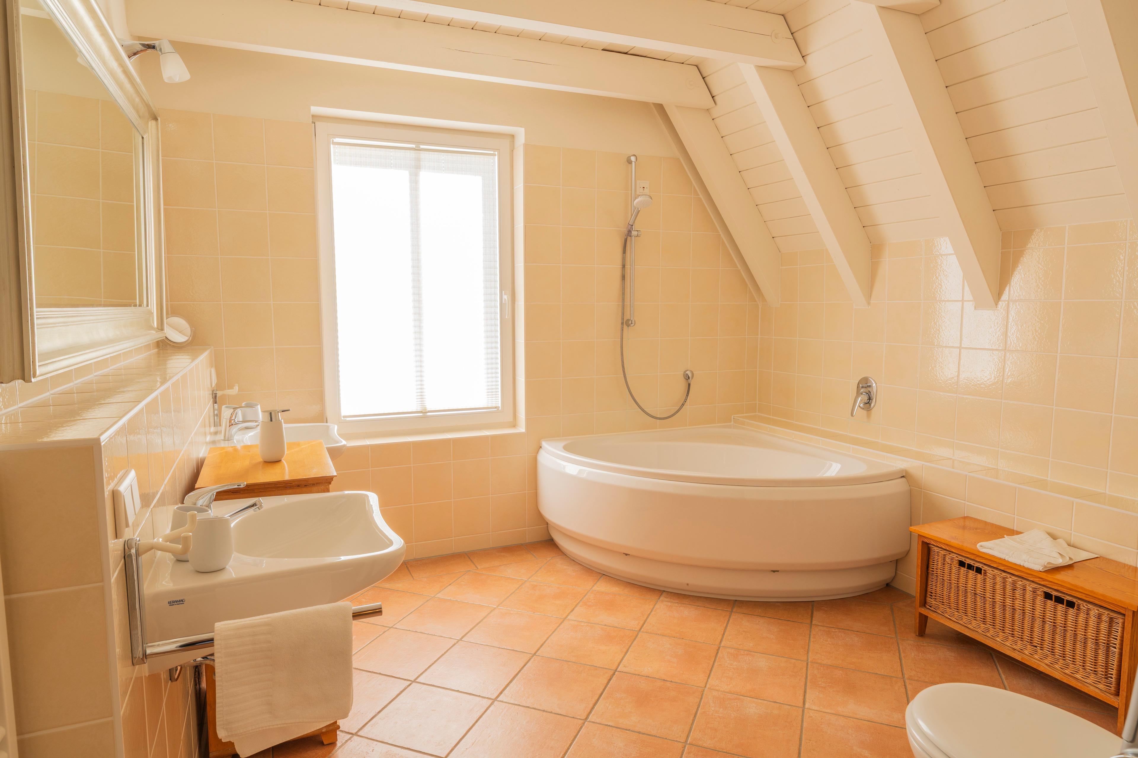 Geräumiges Badezimmer:[nbsp] Mit Eckbadewanne, Dusche, WC und Bidet