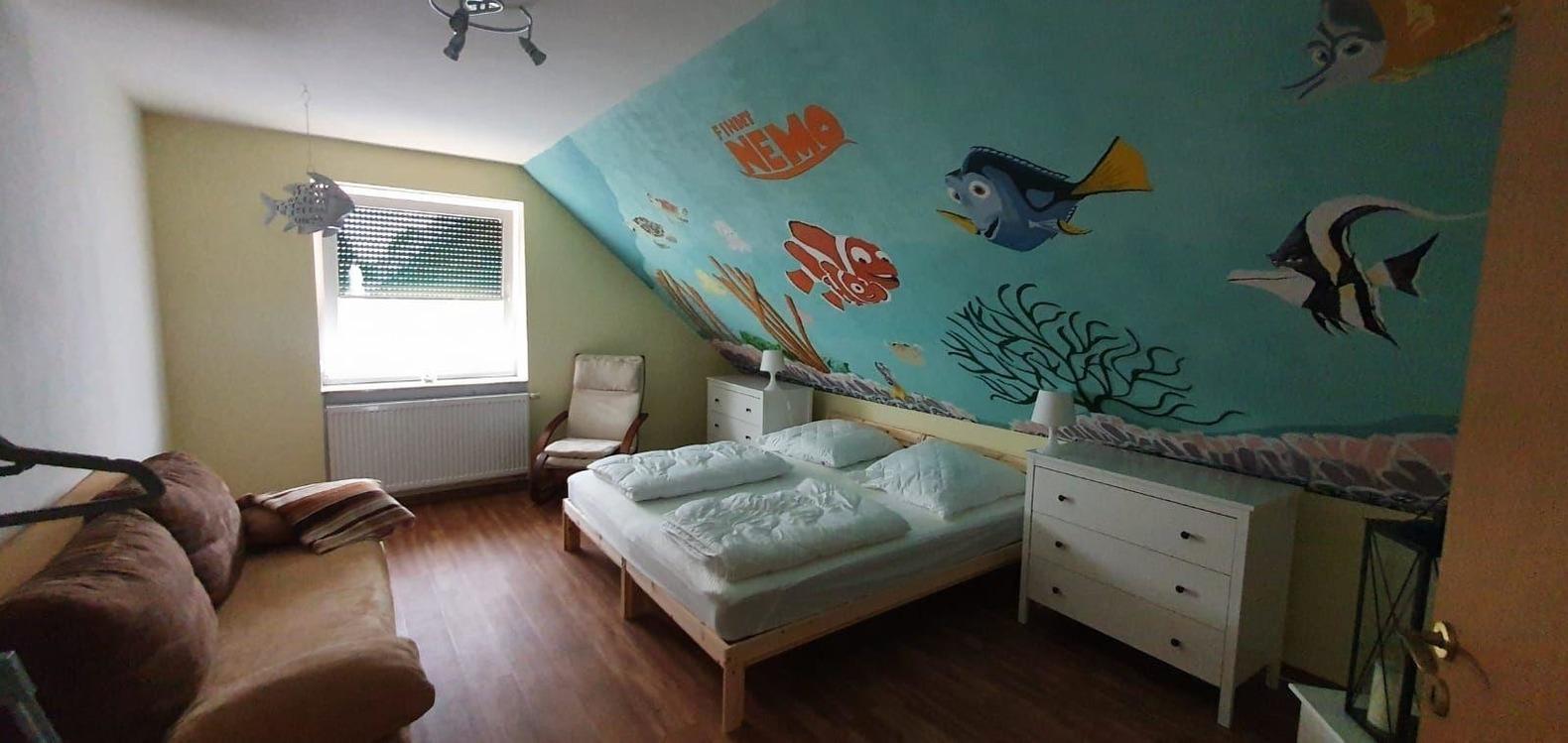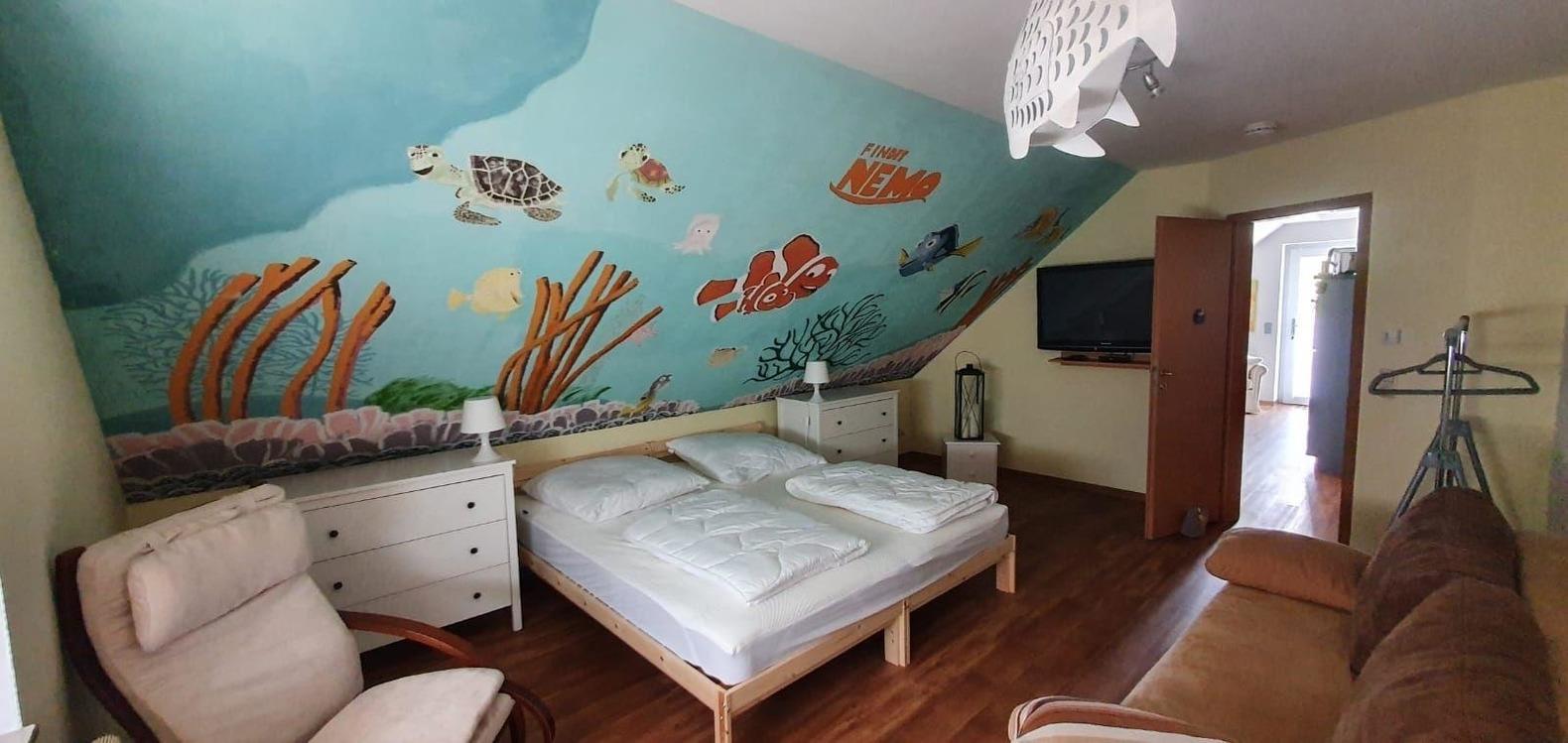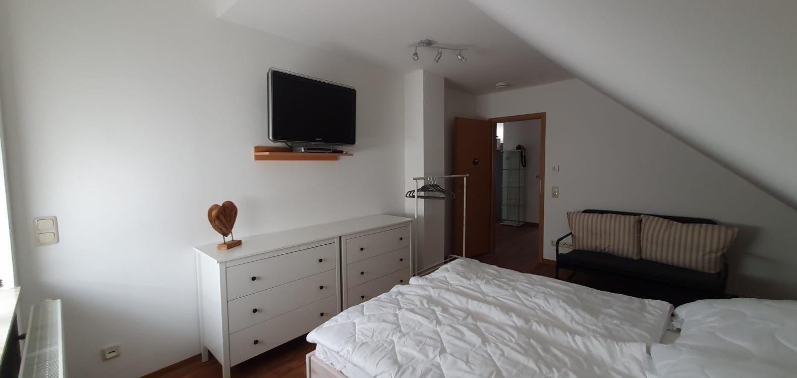 Zwei Schlafzimmer mit je ein Doppelbett (je eine Aufbettung möglich). TV in jedem Zimmer. Freies WLAN im ganzen Objekt.