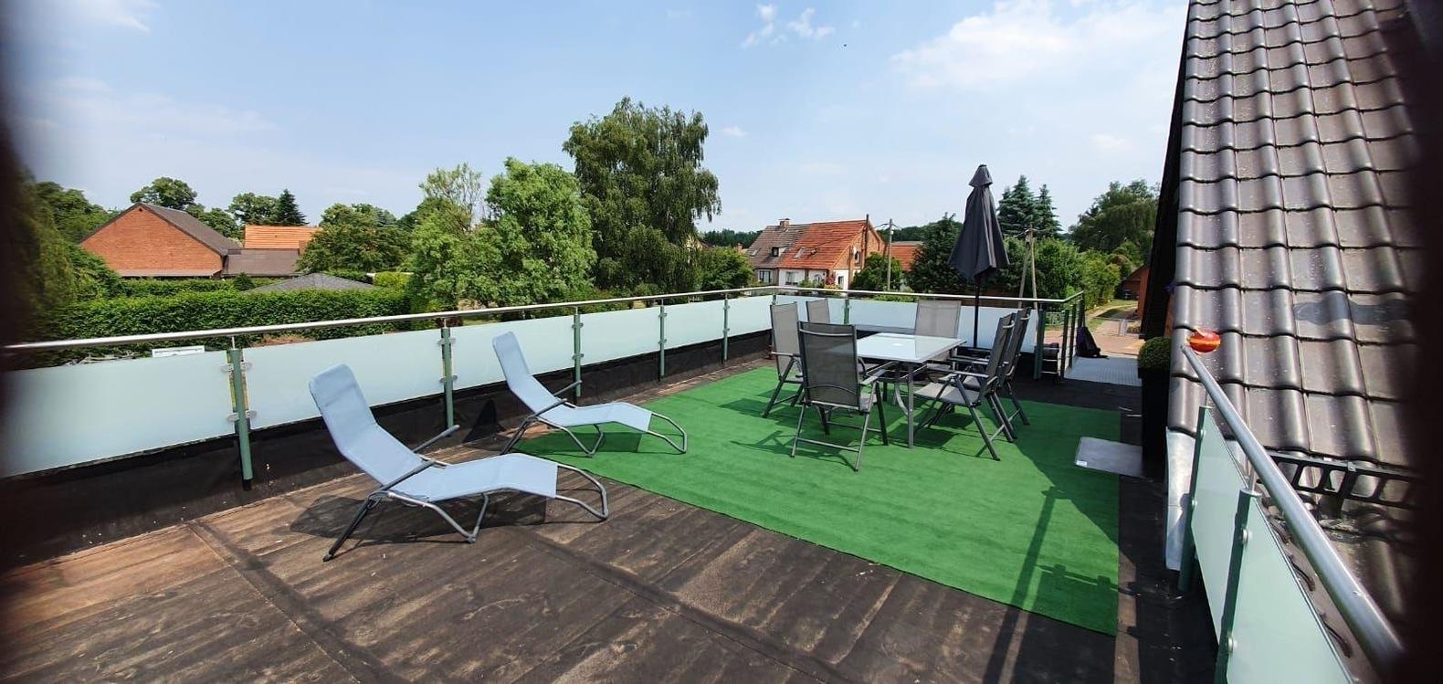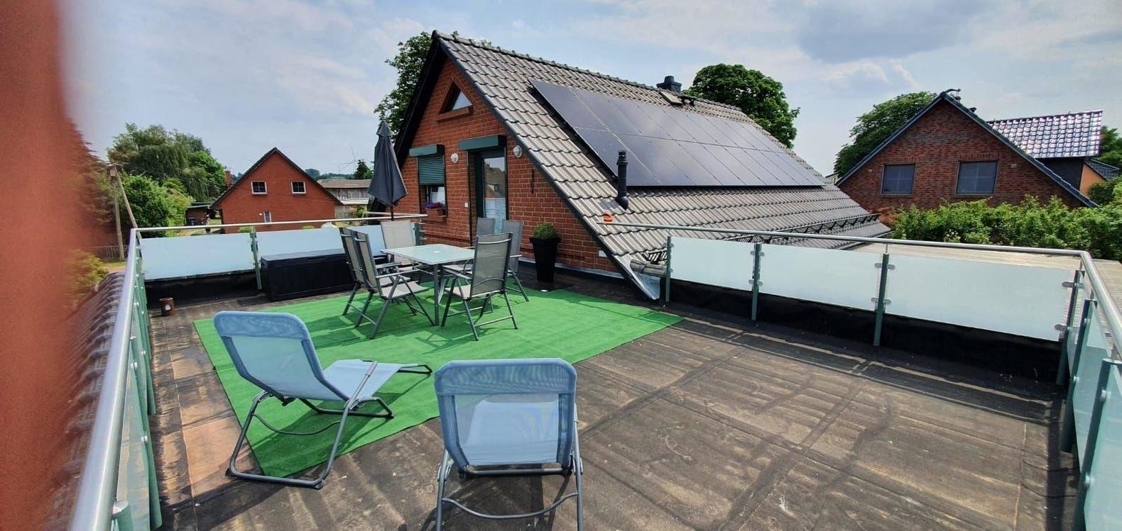 Zum Außenbereich gehört eine Dachterrasse mit Gartenmöbel, Sonnenschirm, Sonnenliegen und ein Elektrogrill.