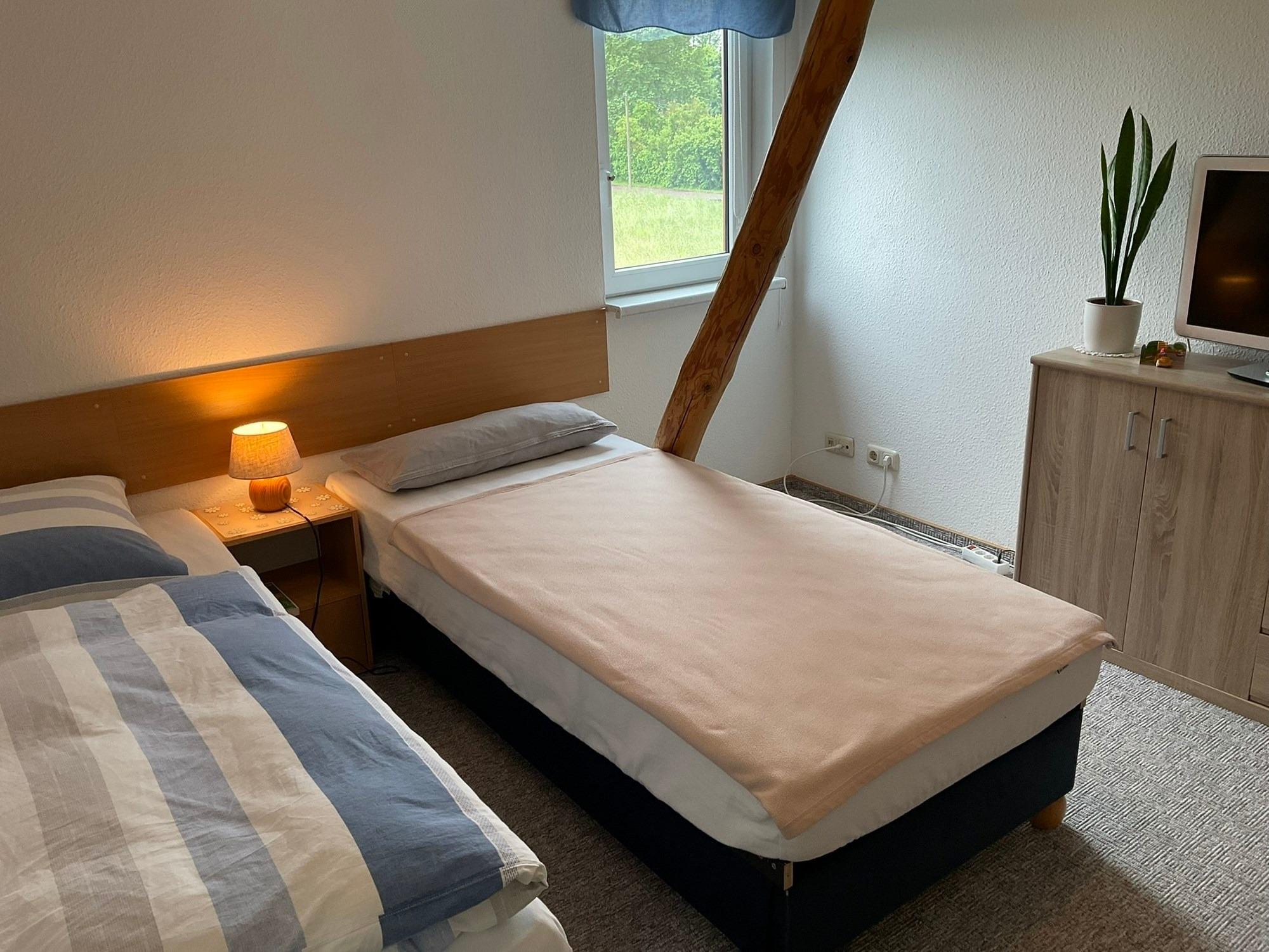 - gemütliches Wohn-/Schlafzimmer mit 2 Einzelbetten (0,90 x 2,00 m), 2 Sitzstühlen, Kleiderschrank und TV