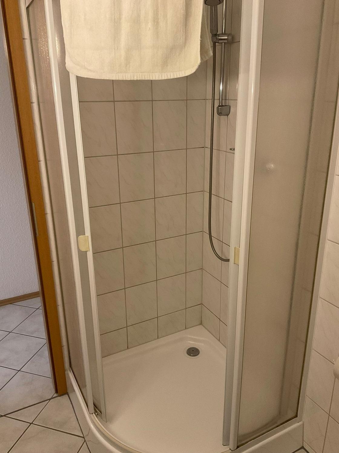 - Badezimmer mit Dusche, WC und Spiegel