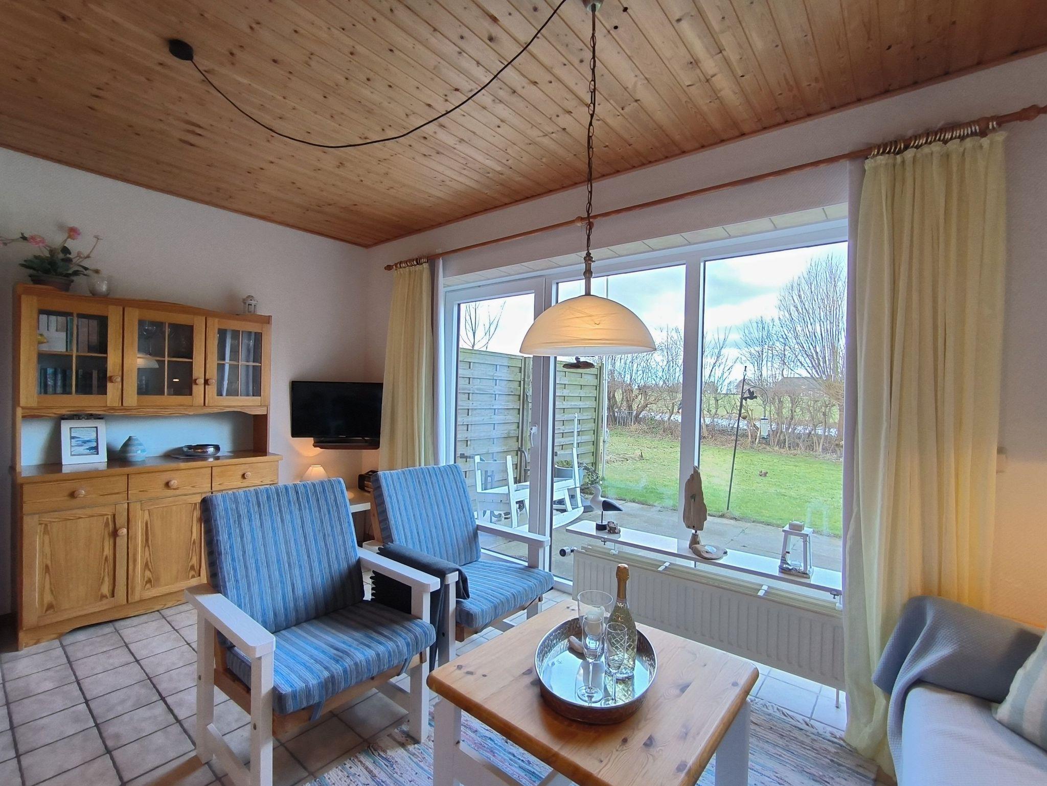 Die Ferienwohnung im Erdgeschoss besteht aus einem großzügigen Wohnzimmer mit offener Küche, einem kleinen Schlafzimmer, einem Duschbad, einem kleinen Hauswirtschaftsraum mit Staumöglichkeiten, dem Flur und der möblierten Terrasse. Das Schlafzimmer verfügt über ein französiches Doppelbett (1,40x2,00m), einen großen, eingebauten Kleiderschrank und ist verdunkelbar und sehr ruhig gelegen. Im Wohnzimmer gibt es eine Sitzecke mit TV, einen Esstisch mit Eckbank und eine Küchenzeile mit Kühlschrank, Herd, Backofen, Spüle und ausreichend Küchenutensilien zum Zubereiten von leckeren Urlaubsmahlzeiten. Eine Spülmaschine ist nicht vorhanden. Das Bad mit Fenster hat eine Dusche, eine Toilette und einen Waschtisch - ein Föhn ist auch vorhanden. Eine Waschmaschine im Erdgeschoss kann von allen Gästen gegen eine kleine Gebühr genutzt werden, auch Fahrräder zum Leihen und der Grill im Garten stehen allen Feriengästen zur Verfügung. Die Betten sind bei Ankunft bereits bezogen und Handtücher sind ebenso vorhanden.