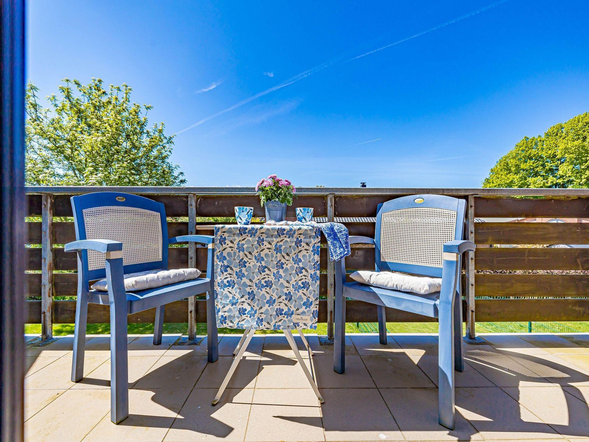 - offener Wohnbereich mit Flachbildschildschirm und Zugang zum Balkon mit Gartenmöbeln