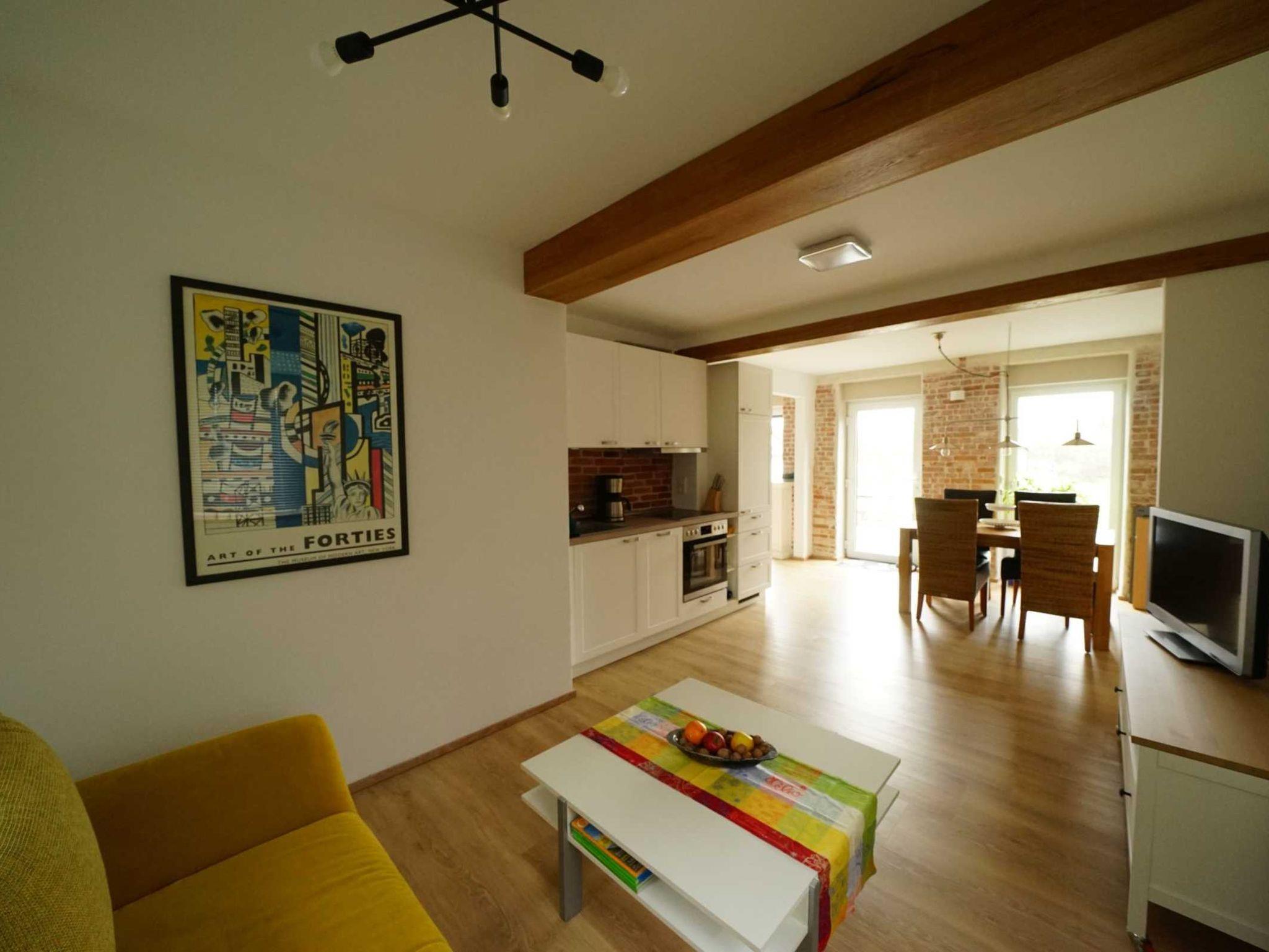 Die ebenerdige Ferienwohnung Die Ostseekoje für bis zu 2 Personen ist in offener Wohnform modern in warmen Farben gestaltet. Auf Anfrage gibt es eine Schlafmöglichkeit für ein Kind auf dem Schlafsofa im Wohnbereich oder im mitgebrachten Reisebett. Die bodentiefen Fenster im Wohn- und Schlafbereich sorgen für ein schönes Licht und lassen sich mit Rolläden abdunkeln. Unter dem Laminatboden sorgt eine Fußbodenheizung in der ganzen Wohnung für kuscheligen Komfort. Die Wohnung ist barrierefrei zugänglich.