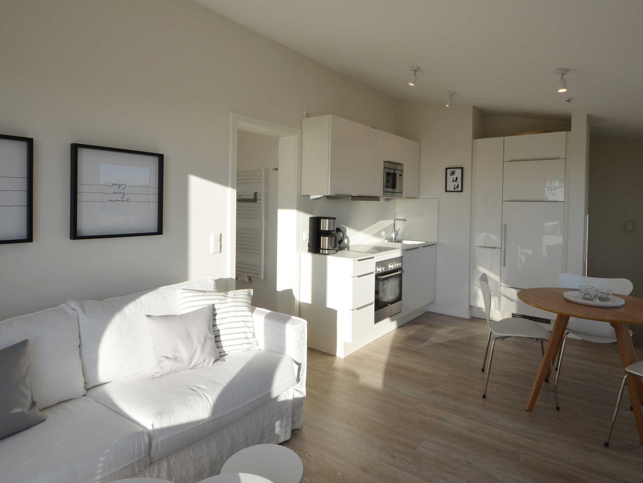 Die dänische Hauptstadt stand Pate für die Einrichtung dieser wunderschönen Ferienwohnung (40 m²). Der für die Dänen so typische puristische Einrichtungsstil in den Farben Weiß und Grau und die Verwendung von Holz finden sich hier ebenso wie der Einsatz von Designklassikern wie den Arne Jacobsen-Stühlen. Das Zusammenspiel der hell gestalteten Wände, weiß/grauen Accessoires und gut positionierten Lichtquellen, sorgt für eine freundliche Atmosphäre. Die weiße Einbauküche ist mit hochwertigen Markengeräten und zahlreichen Küchenhelfern ausgestattet.