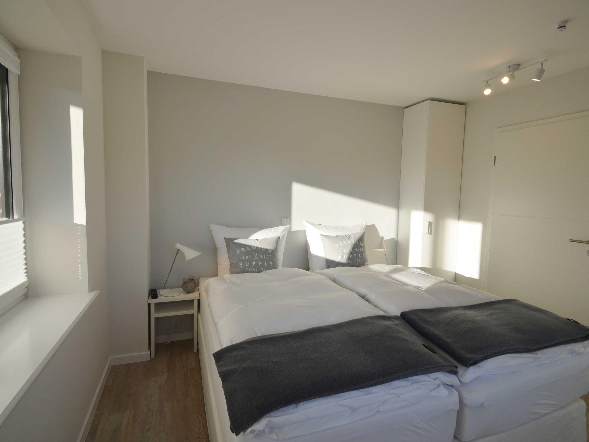Das Schlafzimmer im Erdgeschoss bietet direkten Zugang zum wohnungseigenen, umzäunten Garten mit Terrasse. Direkt an das Schlafzimmer grenzt ein zusätzliches WC. Im Obergeschoss befindet sich ein hell gestaltetes Badezimmer mit Regendusche, das Ihnen einen tollen Meerblick und Morgensonne bietet.