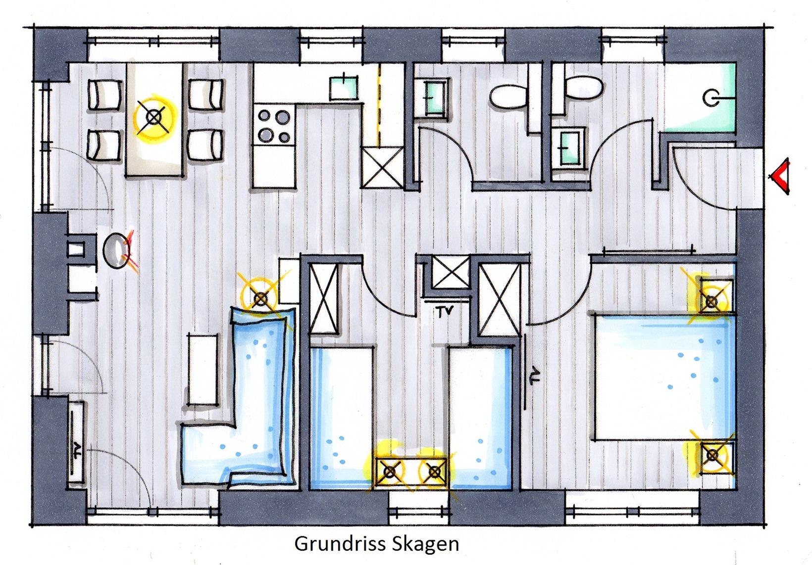 Die Ferienwohnung "Skagen" (60 m²) begeistert durch ihre geschickte Raumaufteilung, die großzügige Terrasse und die hellen Räumlichkeiten. Der Bezug zur See ist in dieser Wohnung deutlich zu erkennen. Die Einrichtung ist im maritimen Stil in den Farben Weiß und Blau gehalten.