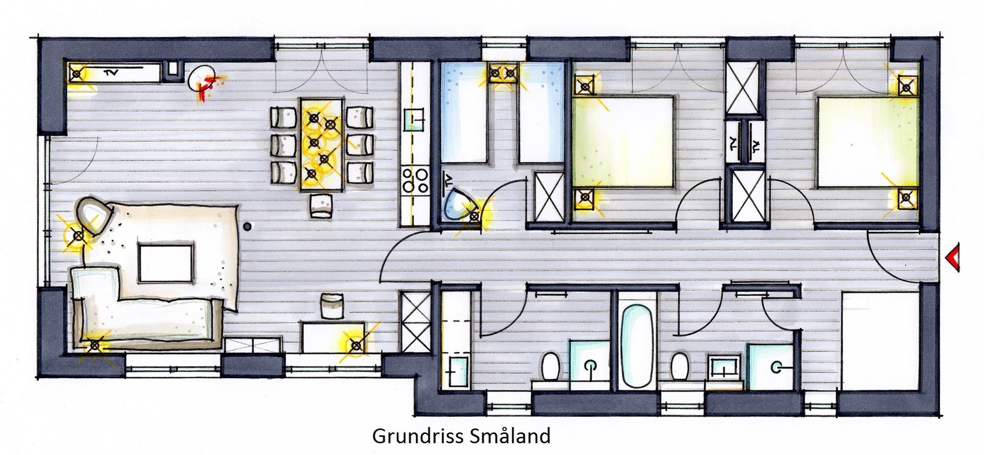 Die 100 m² große Ferienwohnung "Småland" befindet sich im Erdgeschoss und eignet sich hervorragend für Familien. Die Ferienwohnung ist für 6 Personen konzipiert. Drei Schlafzimmer, zwei Bäder, eine SAUNA sowie ein großzügiger Wohn-/Essbereich mit Küchenzeile machen das Urlaubsglück perfekt.