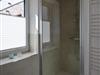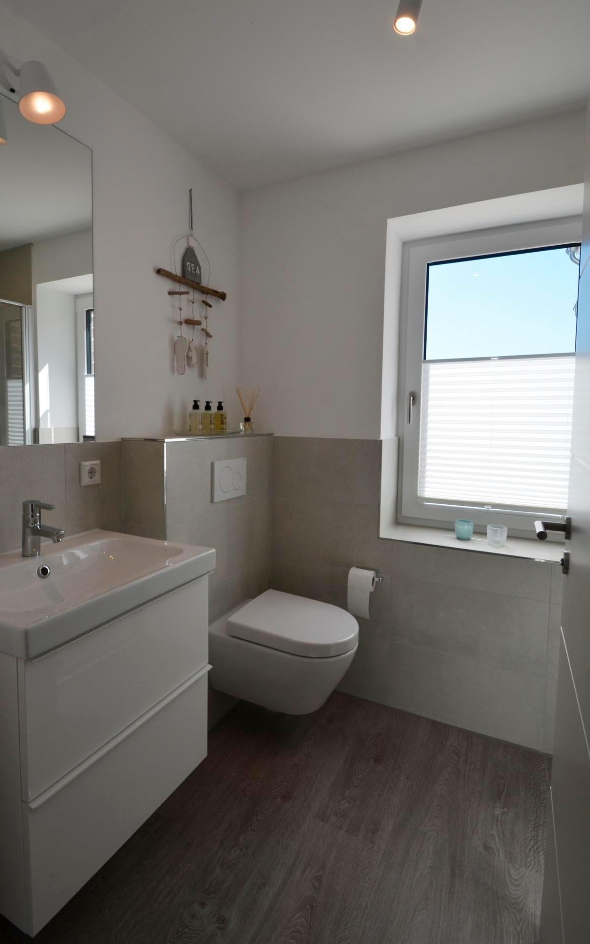 Das Badezimmer verfügt über ein Fenster und besticht durch seine hellen Fliesen. Es ist mit einer Dusche (RAINSHOWER), einem WC und einem Waschtisch mit Unterschrank ausgestattet.