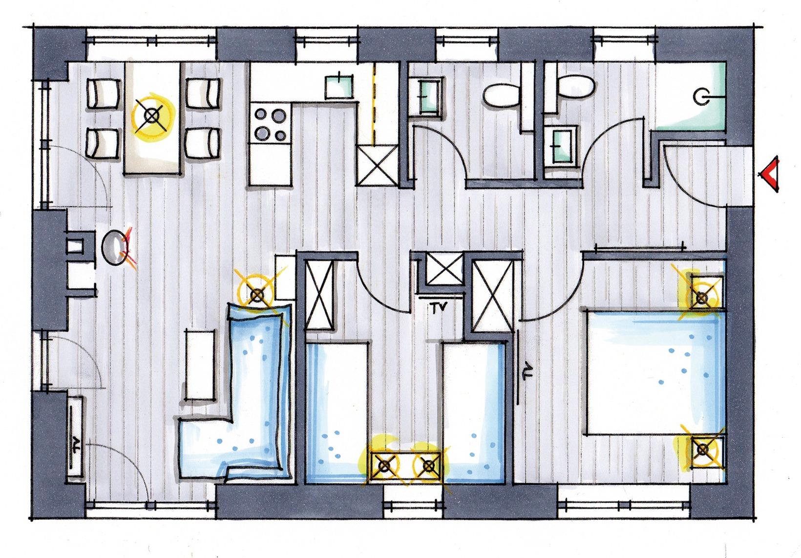 Die Wohnung ist für 4 Personen konzipiert. Der Fußboden ist mit hochwertigen DESIGN-PLANKEN in Holzoptik ausgelegt und wird durch eine FUSSBODENHEIZUNG erwärmt. Alle Fenster sind mit Sichtschutzplissees und in den Schlafräumen mit Verdunklungsplissees versehen.