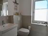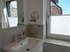 Das Gäste-WC ist mit einem Waschtisch und Unterschrank, einem großen Spiegel sowie einem WC ausgestattet.