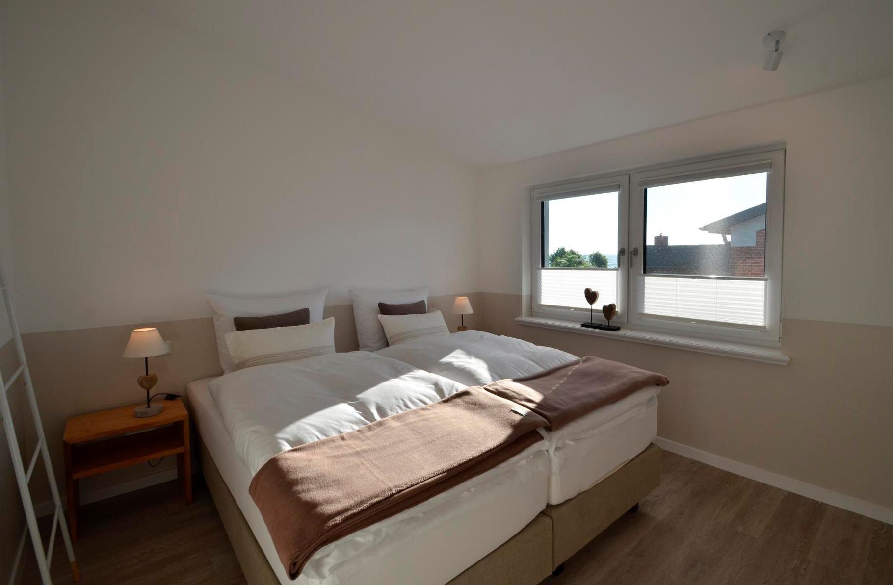 Auch hier wird das hochwertige Einrichtungskonzept der Ferienwohnung fortgeführt. Nachttische aus EICHENHOLZ flankieren das komfortable BOXSPRINGBETT (180x200cm).
