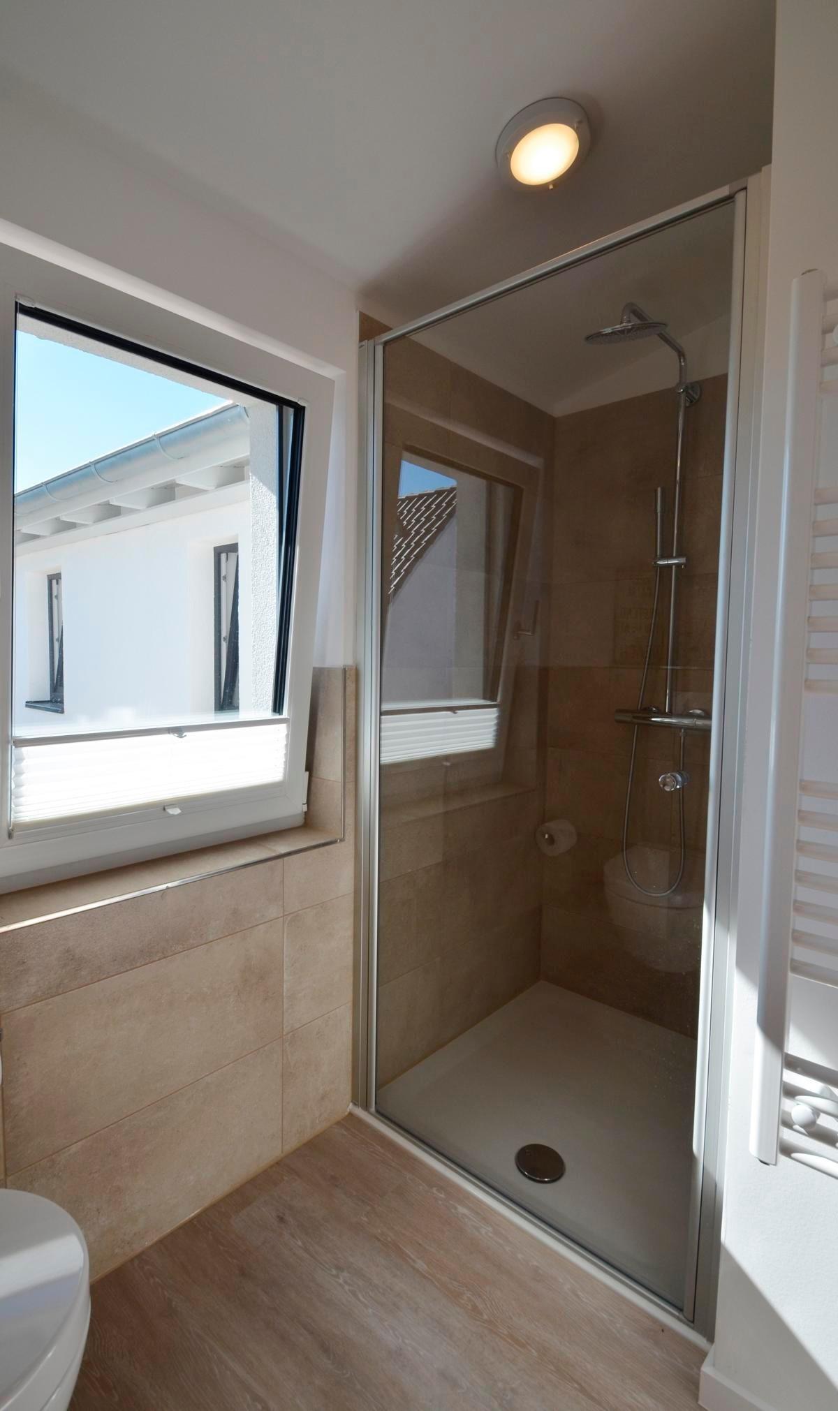 Das Badezimmer verfügt über ein Fenster und besticht durch seine hellen Fliesen. Es ist mit einer Dusche (RAINSHOWER), einem WC sowie einem Waschtisch mit Unterschrank ausgestattet.