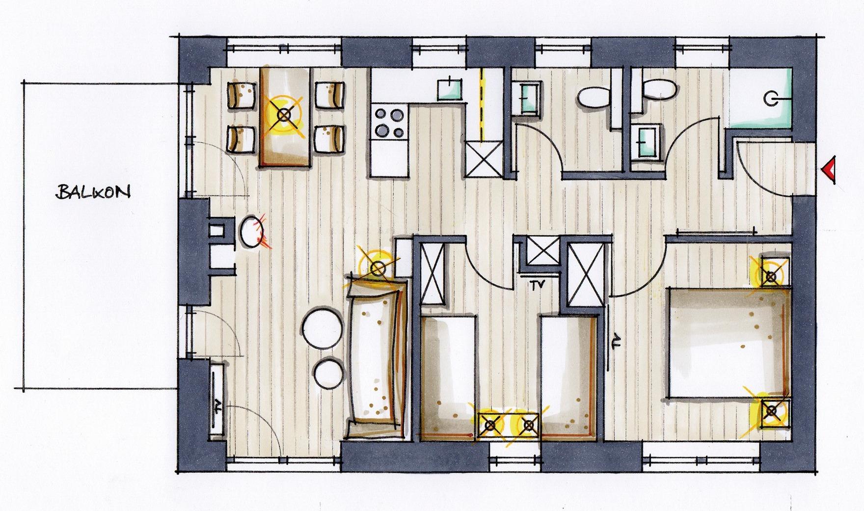 Die Wohnung ist für 4 Personen konzipiert. Der Fußboden ist mit hochwertigen DESIGN-PLANKEN in Holzoptik ausgelegt und wird durch eine FUSSBODENHEIZUNG erwärmt. Alle Fenster sind mit Sichtschutzplissees und in den Schlafräumen mit Verdunklungsplissees versehen.