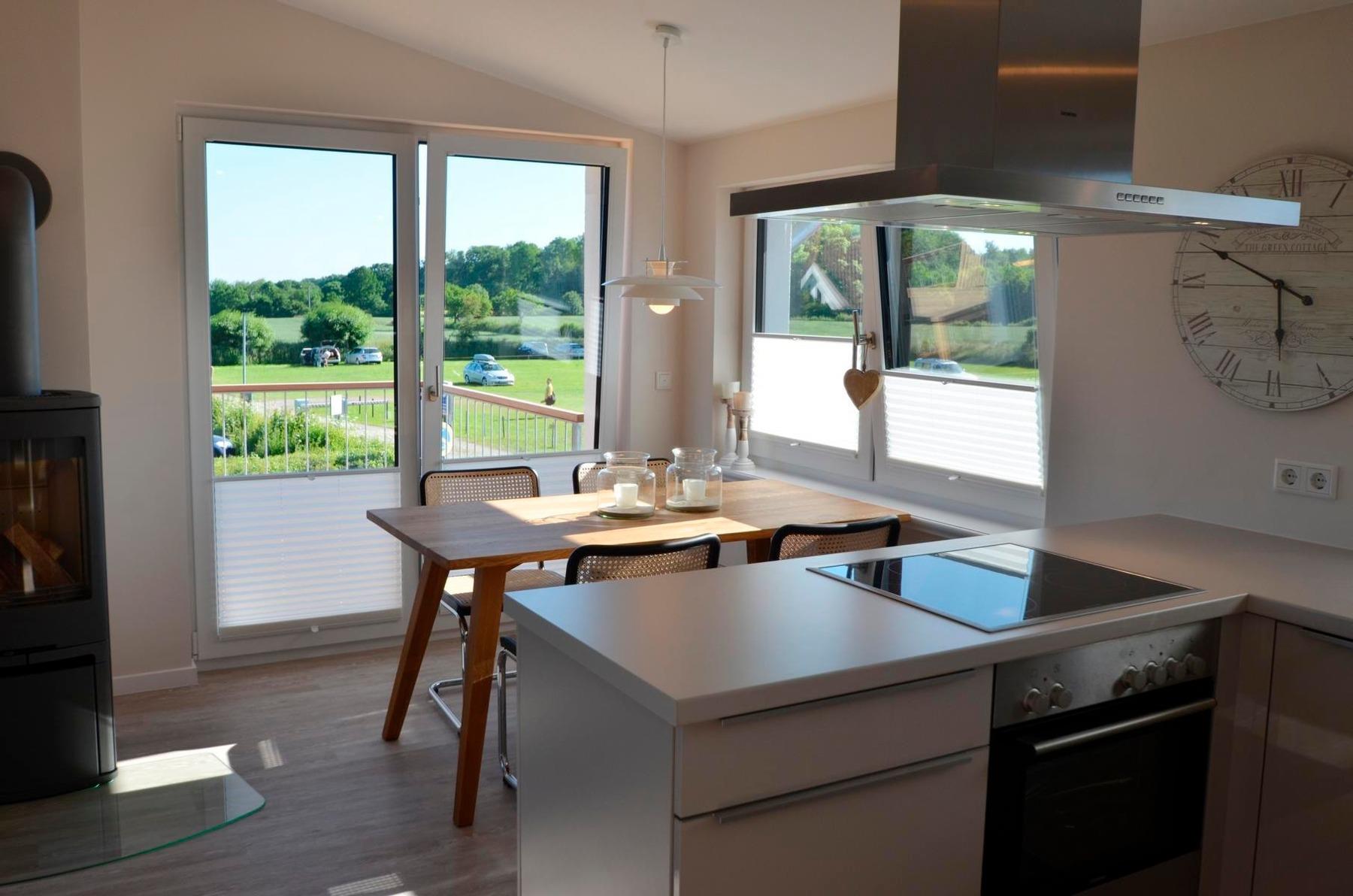 Der Wohnbereich mit Essplatz und Küchenzeile begeistert mit seinem MEERBLICK und vielen bodentiefen Fenstern. Das große und extratiefe Sofa lädt zum Verweilen, Entspannen und Lesen ein.