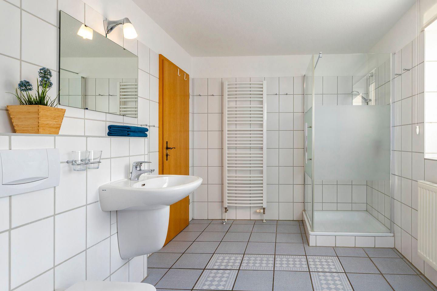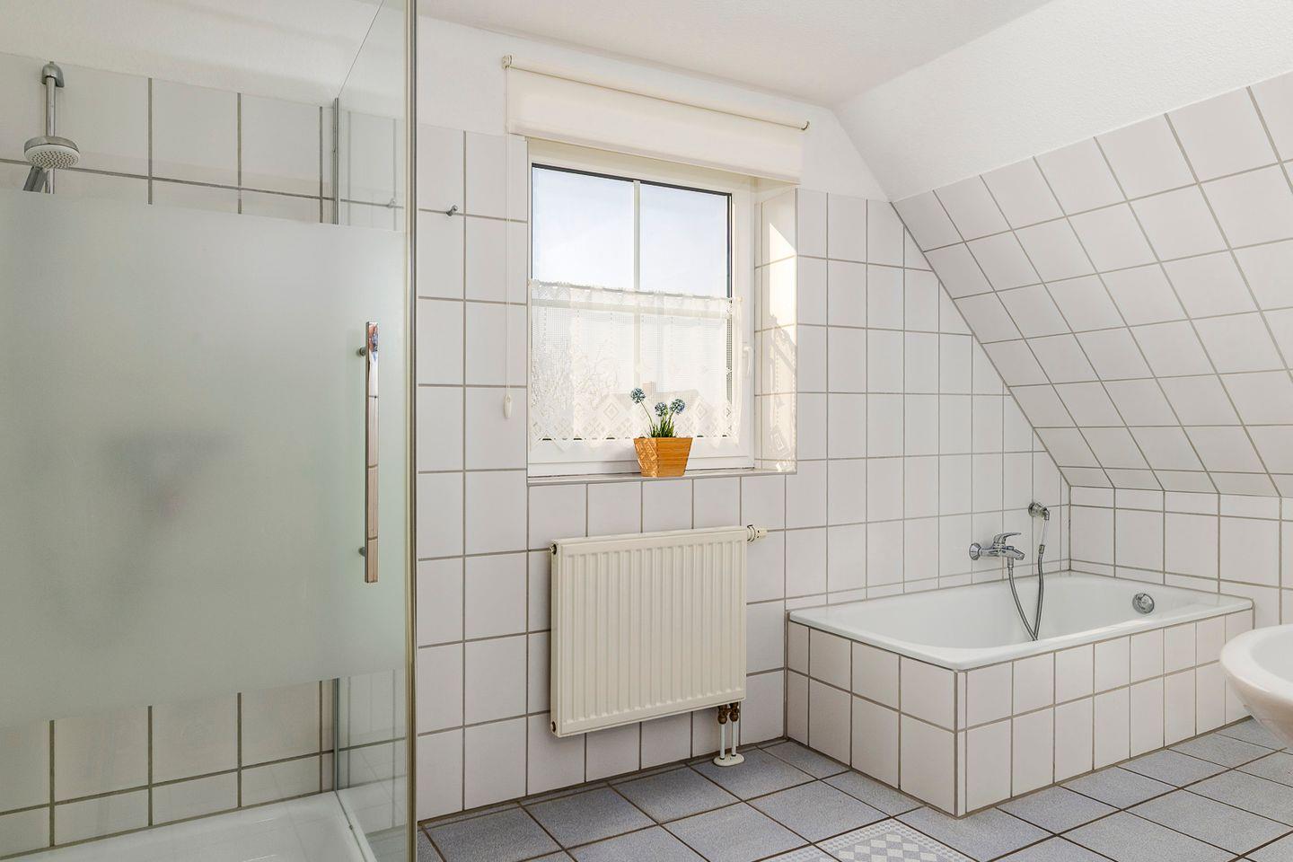 Im Erdgeschoss ist ein Gäste-WC mit Dusche und im Obergeschoss finden Sie ein großes helles Tageslichtbad mit Badewanne.