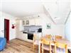 Der großzügige Wohn- und Essbereich ist mit einer voll ausgestatteten Küche verbunden, die über einen 4-Platten Elektroherd, Backofen, Kühlschrank mit Gefrierfach, Spülmaschine, Filterkaffeemaschine, Wasserkocher und Toaster verfügt. Für Ihre Bequemlichkeit stehen eine Waschmaschine und Trockner zur gemeinschaftlichen Nutzung bereit (Münzbetrieb).