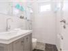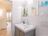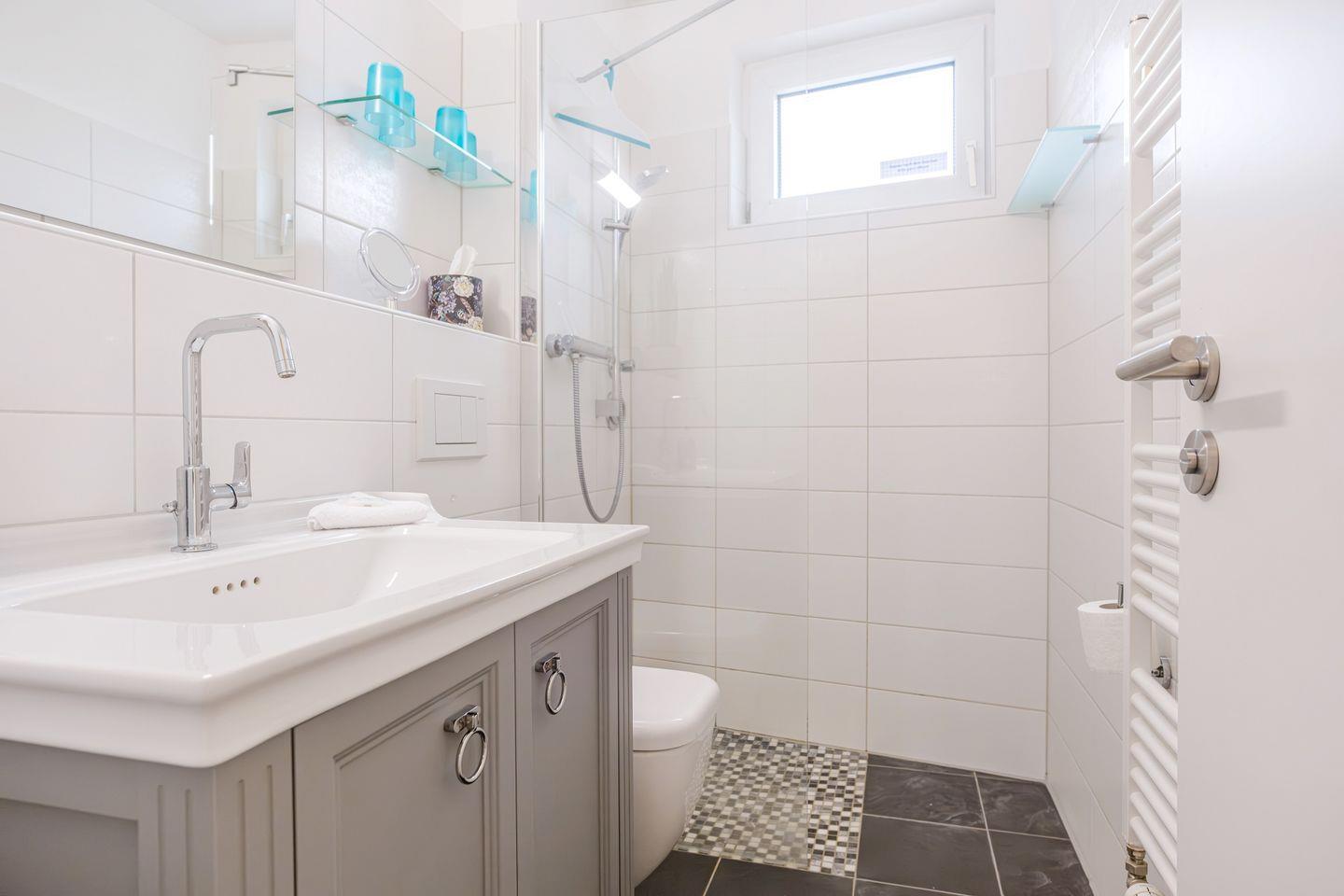 Das ebenerdige Tageslichtbad verfügt über eine Dusche mit Glasabtrennung und Duschregal, einen Handtuchwärmer, einen Föhn, einen Kosmetikspiegel sowie einen Waschtisch mit geräumigem Unterbauschrank.