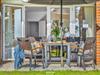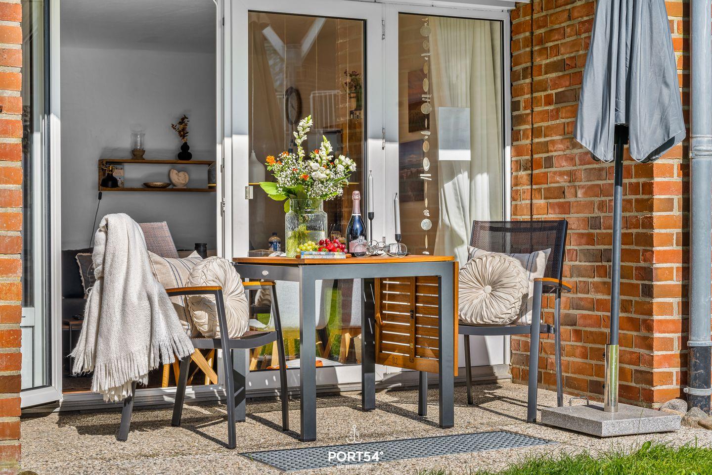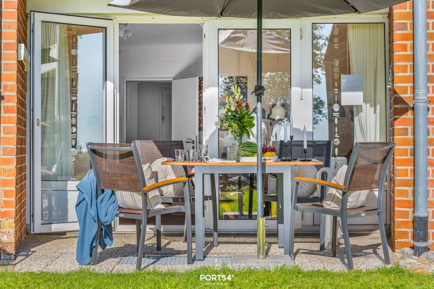 Auf der Terrasse mit hochwertigen Aluminium- und Holz-Terrassenmöbeln kannst Du Dich mit Blick auf die Ostsee und die gepflegte Gartenanlage rundum wohlfühlen.