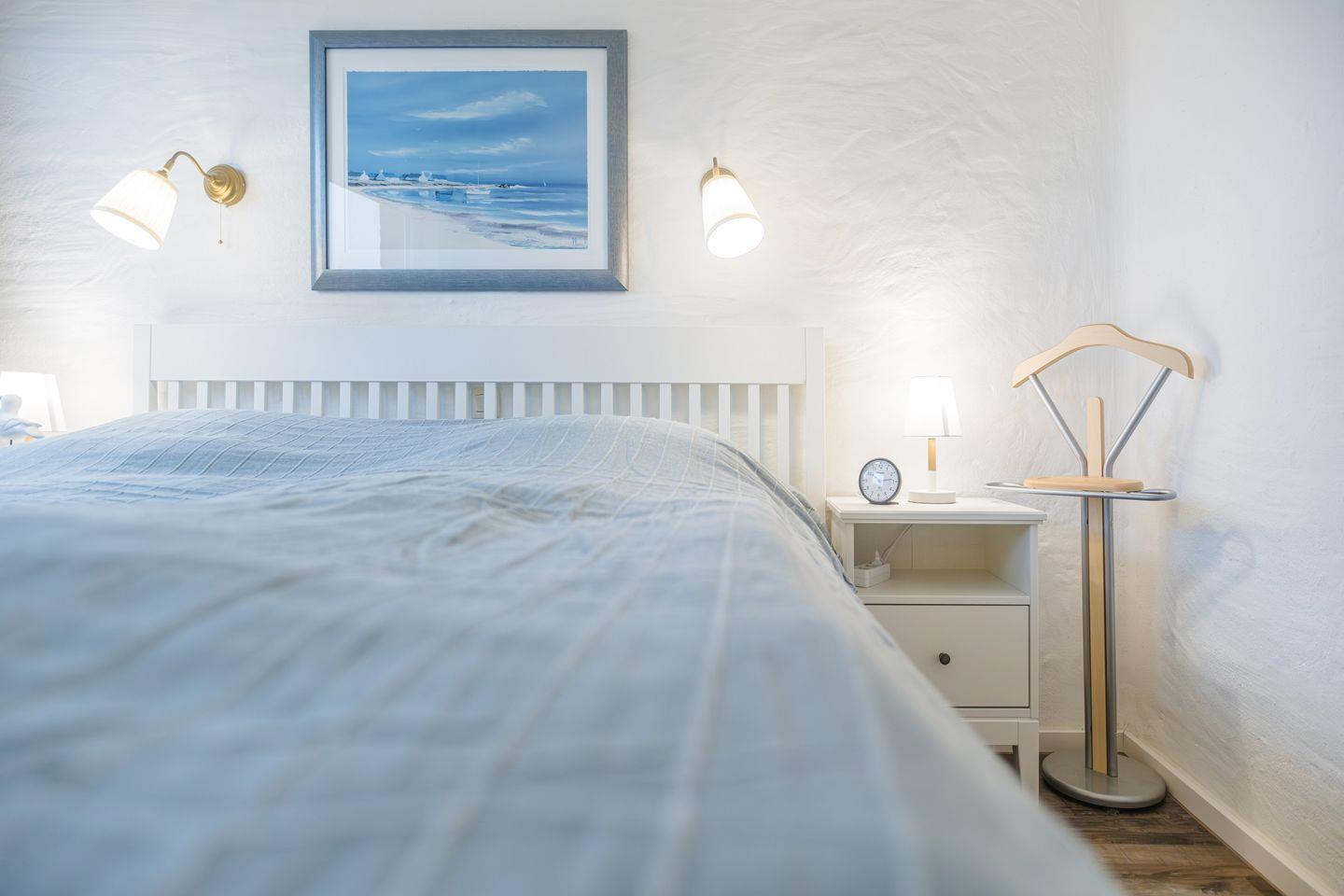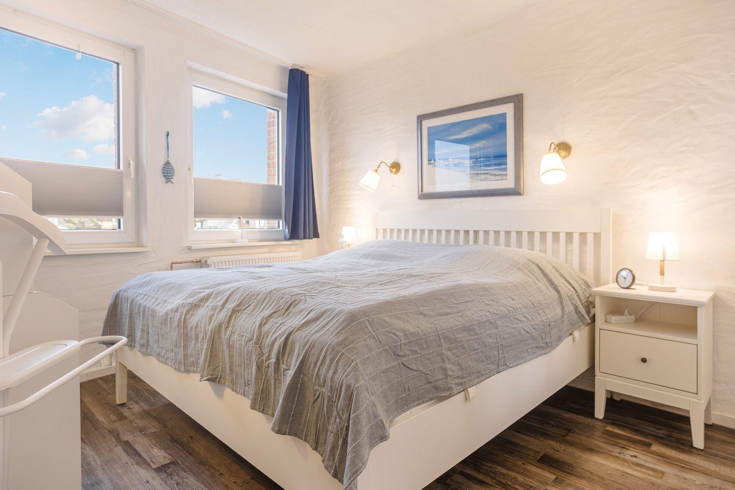 Das Schlafzimmer ist mit einem Doppelbett (180 x 200 cm), zwei Nachttischen, einer offenen Kleider-, Regal- und Schubladenkombination mit ausreichend Platz für Deine Urlaubsgarderobe, einer Ambiente-Leuchte, zwei Wand- und zwei Leselampen, Verdunkelungs-Plissees, Vorhängen sowie einem integrierten Fliegengitter ausgestattet.