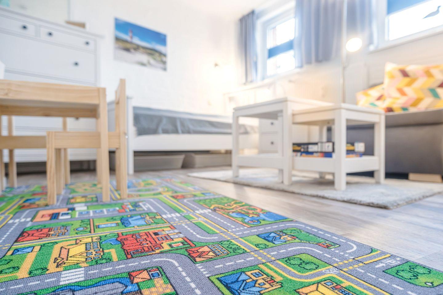 Falls Du mit kleinen Kindern anreist, stehen Dir zudem ein Spielteppich mit kleinen Autos, ein Maltisch sowie zwei Stühlchen zur Verfügung.