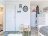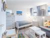 Außerdem findest Du dort eine geräumige Kommode, einen auf 90 x 200 cm ausziehbaren Schlafsessel mit Matratzenauflage im Abstellraum sowie einen Couchtisch, einen Teppich, einen Deckenfluter mit integrierter Leselampe und eine Dartscheibe.
