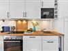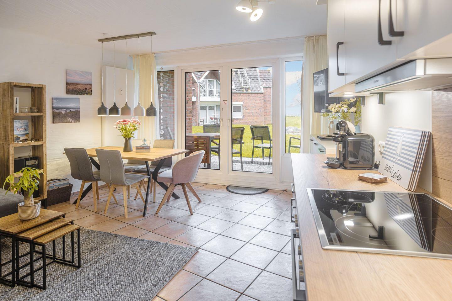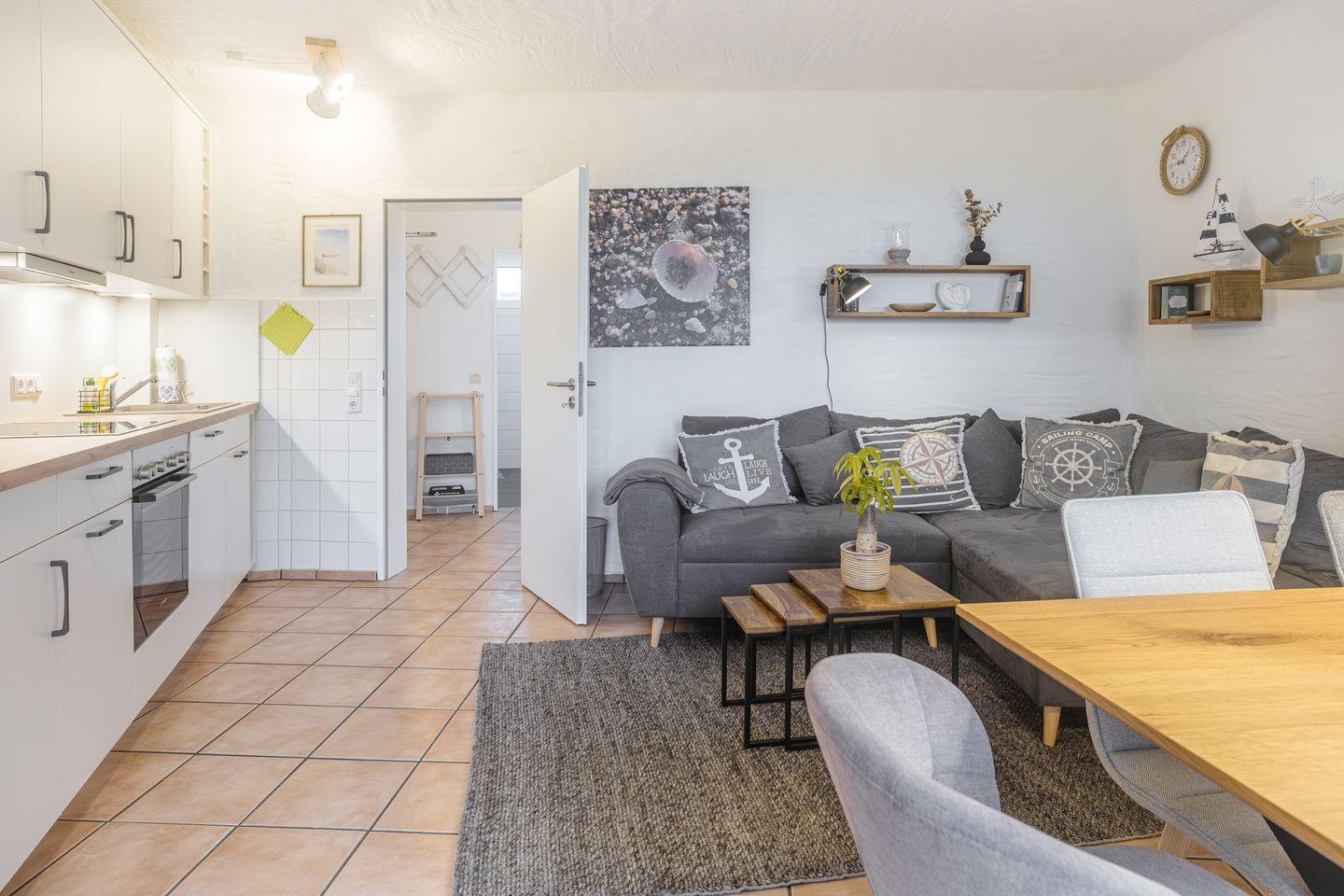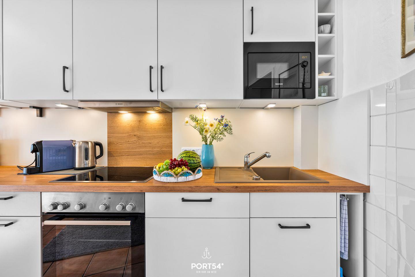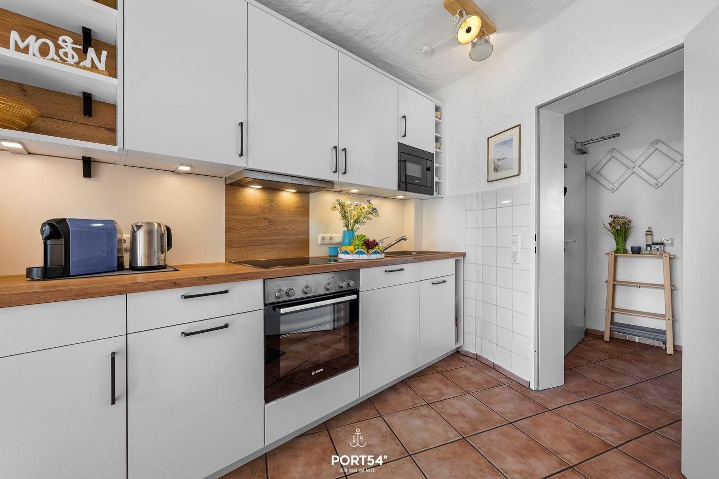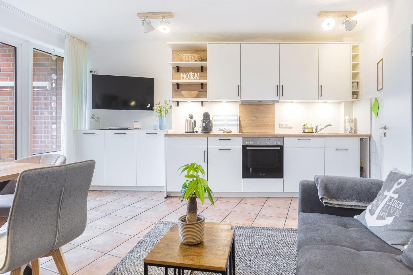 Zur Ausstattung zählen ein Cerankochfeld, ein Backofen, ein Geschirrspüler, eine Kaffee- und eine Kaffeekapselmaschine (Tassimo), ein Wasserkocher, ein Toaster, ein Handmixer, ein Eierkocher sowie viel Stauraum für „dütt un datt“.