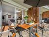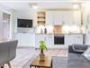Der an der Wand befestigte und schwenkbare 40-Zoll-Fernseher ist von jedem Sitzplatz im Wohn- und Essbereich einsehbar.