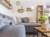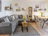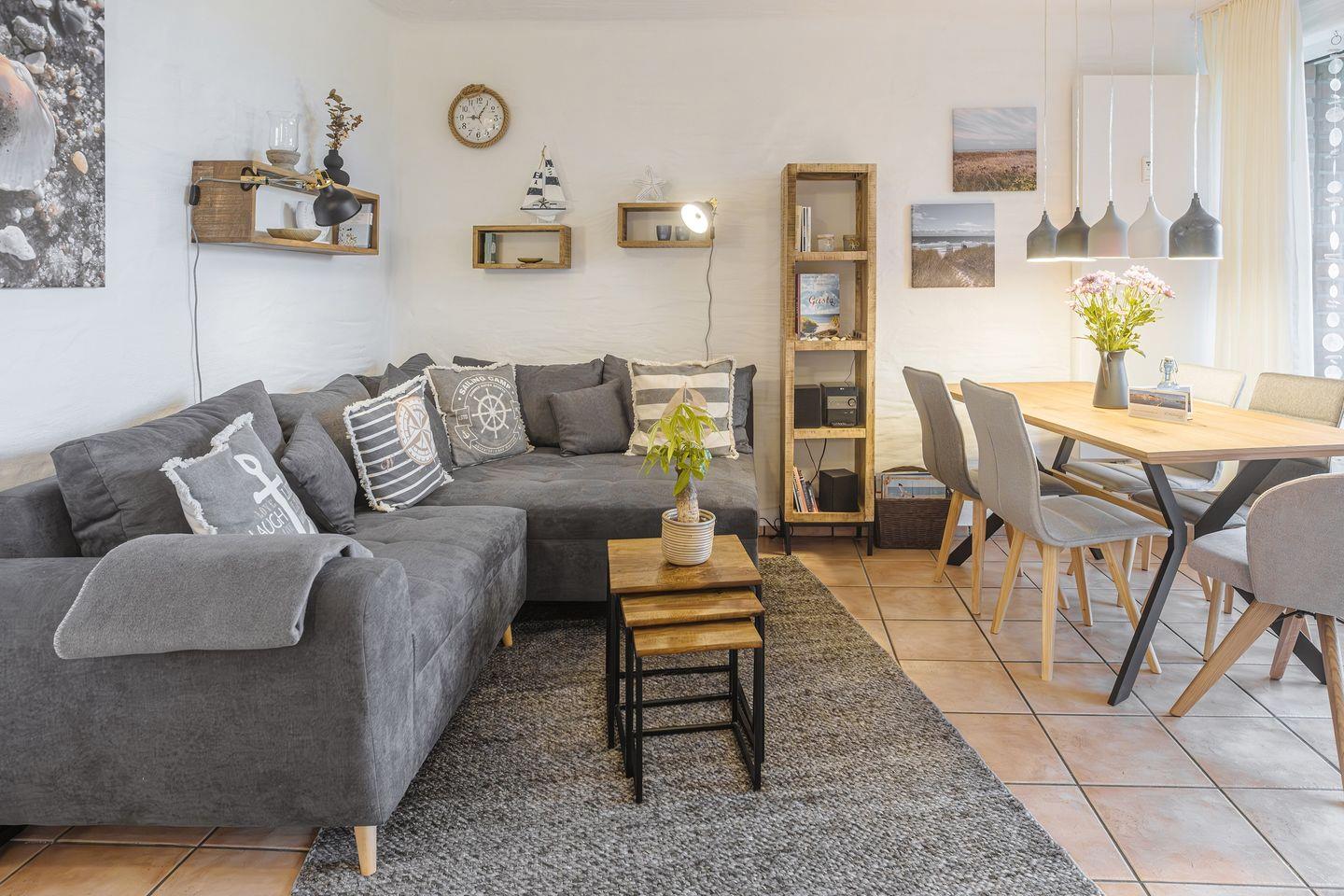 Ein komfortables Ecksofa für bis zu fünf Personen mit angenehmer Beleuchtung und Teppich lädt Dich zum gemütlichen Lesen, zu einem Glas Wein oder zum Fernsehen ein.
