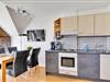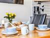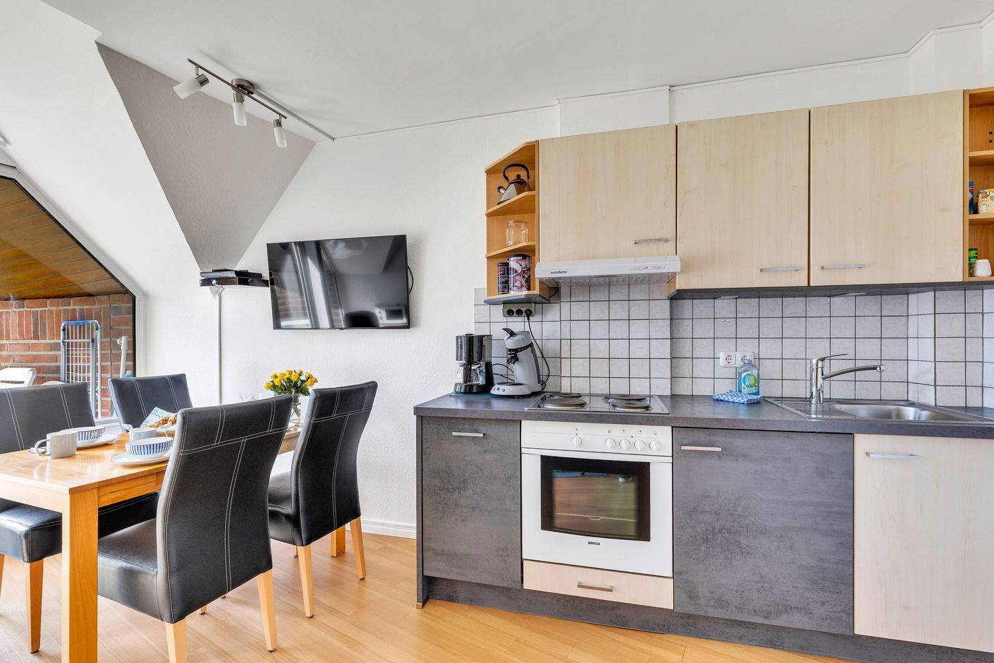 Auf der unteren Etage befindet sich das Herzstück der Wohnung - der helle Wohnbereich mit offener Küche und integriertem Essplatz – perfekt für gemeinsame Mahlzeiten und gesellige Abende. Für Unterhaltung sorgen TV, Radio mit CD-Spieler sowie eine Auswahl an Spielen und Büchern. Die Küche ist umfassend ausgestattet und lässt keine Wünsche offen: Backofen, 4-Platten-Herd, Mikrowelle, Kühlschrank mit Gefrierfach, Spülmaschine, Kaffeemaschine, Senseo-Espressomaschine, Wasserkocher, Toaster, Eierkocher und Handrührgerät – hier kannst Du Dich kulinarisch voll entfalten.