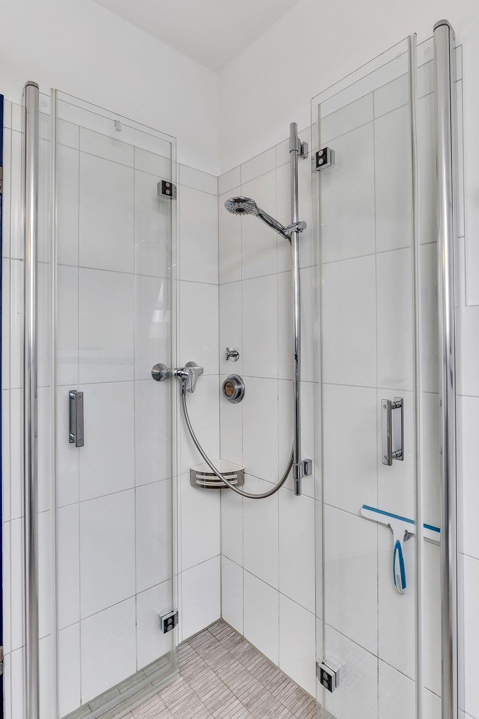 Das Tageslicht-Bad ist mit einer bodengleichen Dusche, Handtuchheizkörper und Haartrockner ausgestattet.