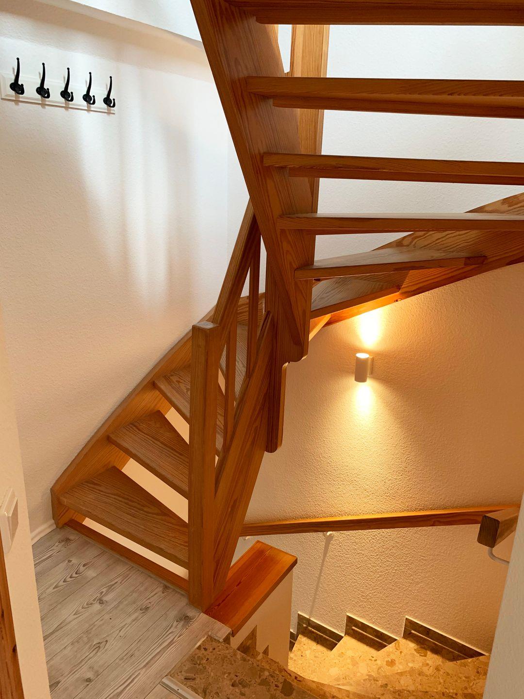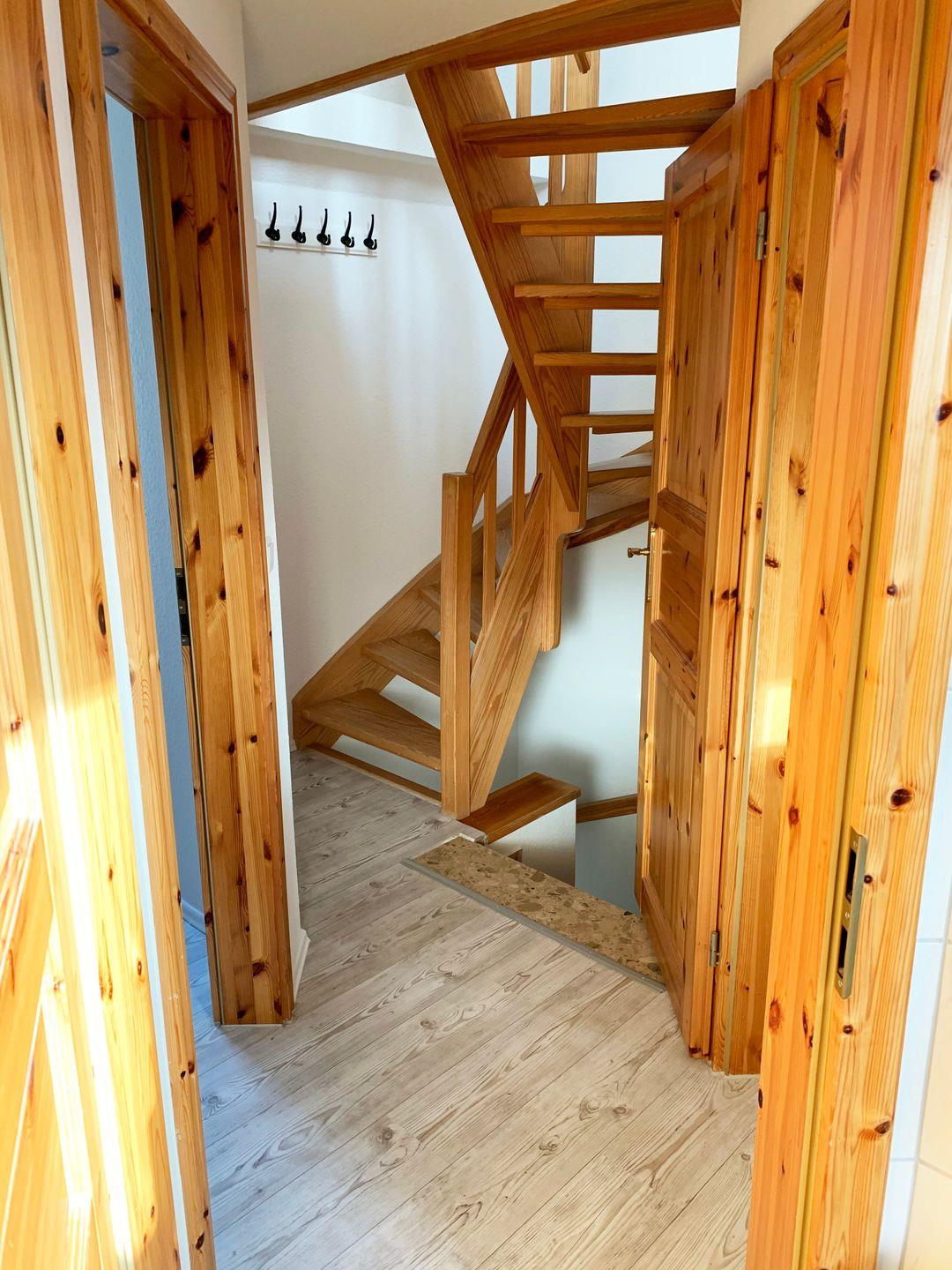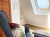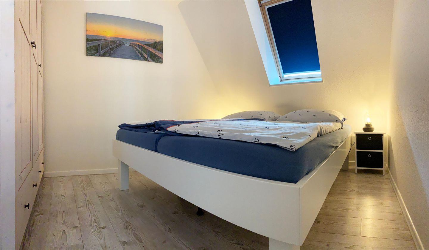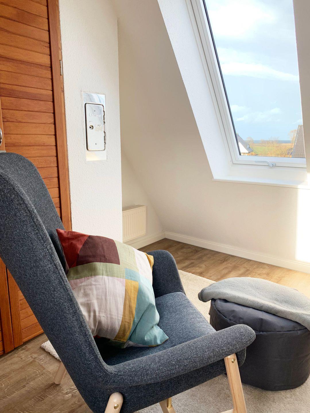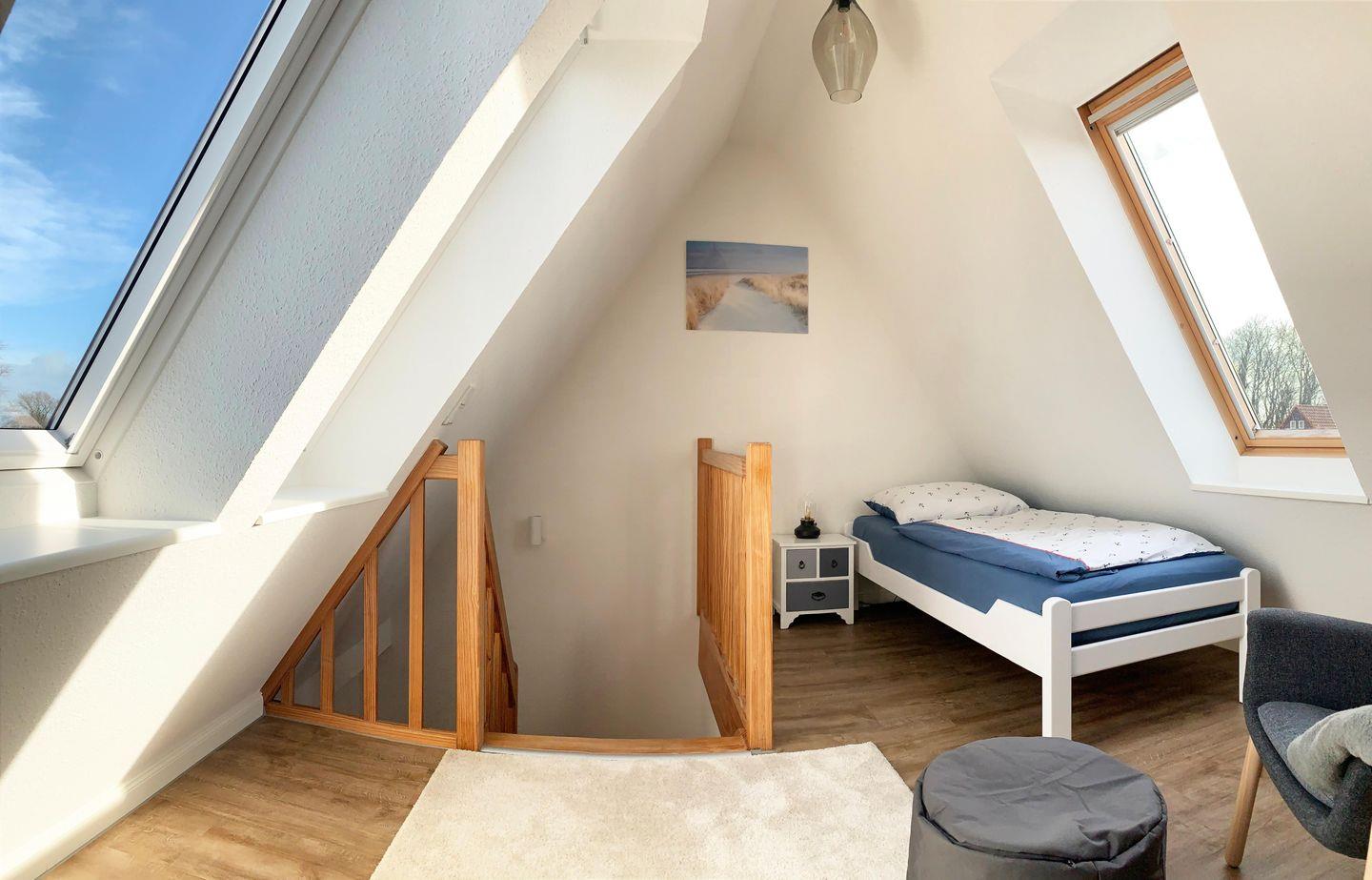 Über das Treppenhaus erreichen Sie das Obergeschoss, in dem sich zwei der drei Schlafräume befinden. Das erste Schlafzimmer ist mit einem Doppelbett (160x200 cm, getrennte Matratzen) ausgestattet, während das zweite Zimmer über ein gemütliches Einzelbett verfügt. Hier finden Sie auch das helle Tageslichtbad mit Dusche und WC. Ein ganz besonderes Highlight erwartet Sie im ausgebauten Dachstudio: Die offene Galerie bietet nicht nur eine weitere Schlafmöglichkeit mit Einzelbett, sondern auch eine Leseecke. Von hier oben genießen Sie einen weiten Panoramablick überdie Felder bis hin zur Ostsee. Damit Sie jederzeit ungestört ruhen können, verfügen alle Schlafräume über Verdunklungsmöglichkeiten.