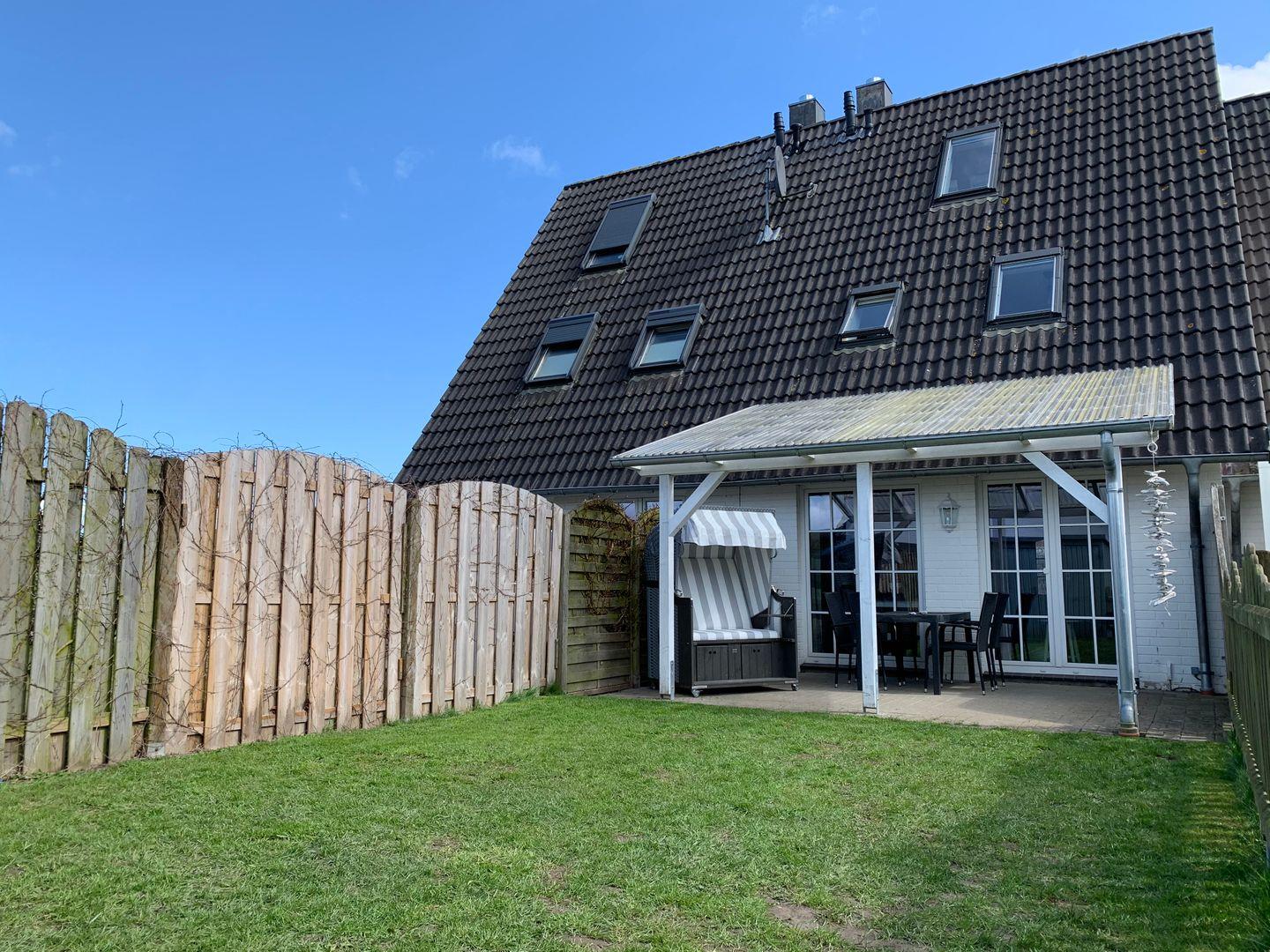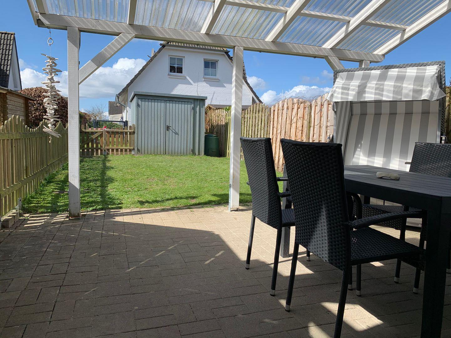 Auch der Außenbereich der Kleinen Strandkoje ist eine wahre Wohlfühloase. Die überdachte Terrasse mit Gartenmöbeln und Grill sowie der eigene Strandkorb laden zum Entspannen unter freiem Himmel ein. Da der Garten komplett eingezäunt ist, kann auch Ihr Hund (auf Anfrage gestattet) hier sicher verweilen. Für Aktivurlauber bietet das Haus durchdachte Details wie eine Außensteckdose zum Laden von E-Bikes sowie eine abschließbare Abstellmöglichkeit für Fahrräder im Schuppen, der bequem von der Rückseite des Grundstücks erreichbar ist. Zwei PKW-Stellplätze direkt am Objekt und praktische Annehmlichkeiten wie eine eigene Waschmaschine und Bügelzubehör runden das Angebot ab. Ob Familienurlaub mit Spielplatz in der Siedlung oder eine Auszeit zu zweit – in der Kleinen Strandkoje beginnt die Erholung direkt an der Haustür.