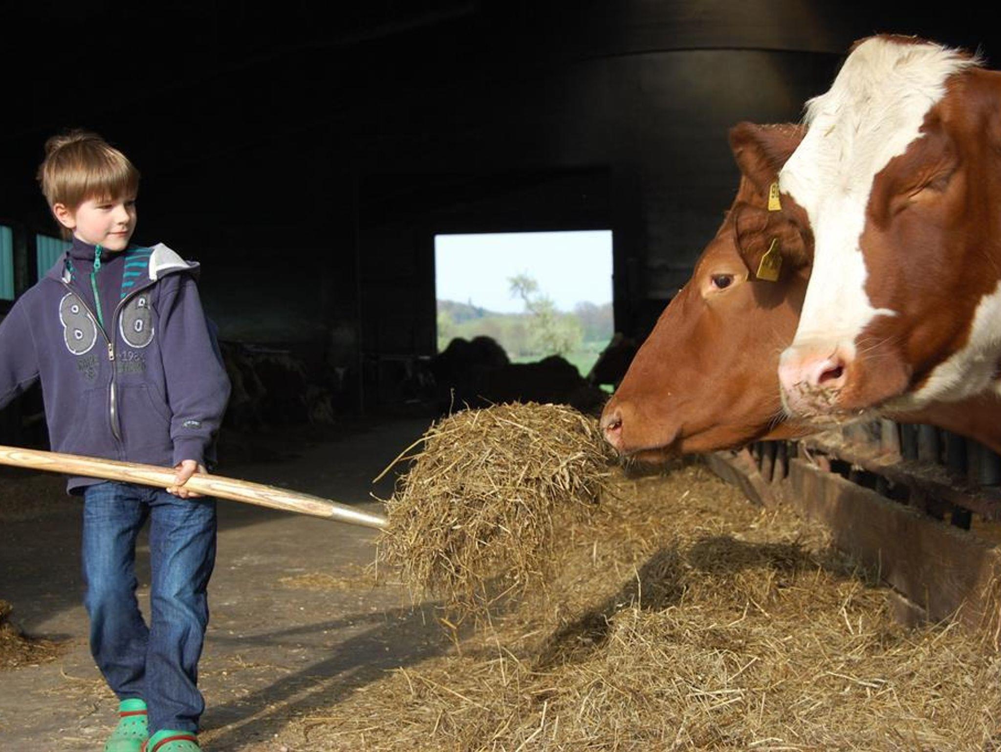 Zum Ferienhof gehört ein voll bewirtschafteter Bauernhof mit Kühen, Ponys und Katzen in 150 m Entfernung. Hier können Sie hautnah beim Melken zusehen und mithelfen oder mit dem Traktor mitfahren.