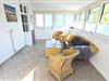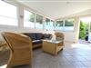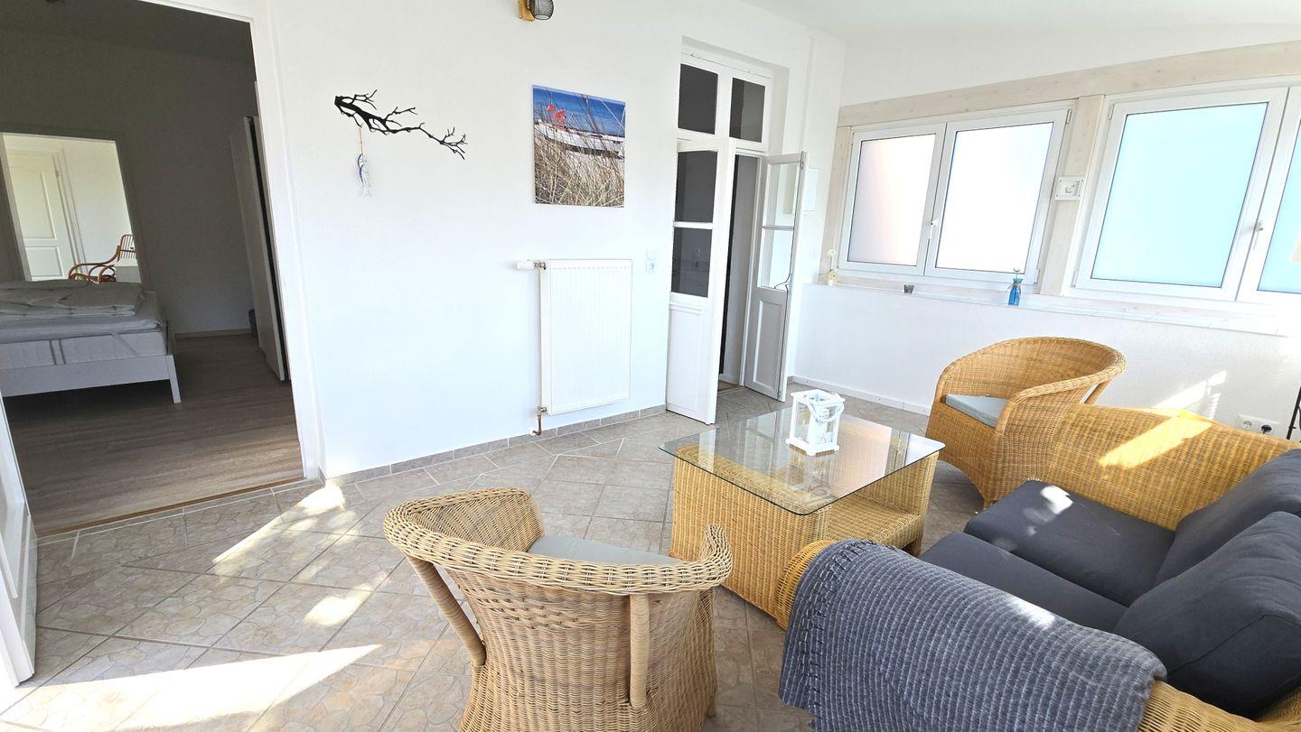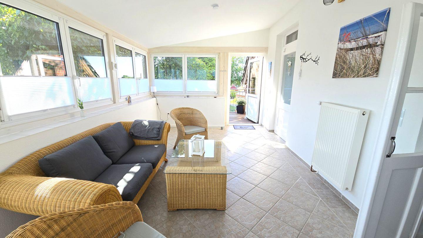 Der Wohnbereich bietet eine gemütliche Sitzecke mit Couch, Schaukelstuhl und Fernseher. Vom Doppelbettzimmer und der Küche aus gelangt man in den verglasten Wintergarten mit Blick in den Garten, der zusätzlichen Raum zum Verweilen bietet. Die Küche ist vollständig ausgestattet mit Herd, Backofen, Kühlschrank, Spülmaschine, Kaffeemaschine, Wasserkocher und Toaster. Ein Esstisch mit fünf Sitzplätzen befindet sich ebenfalls im Küchenbereich.