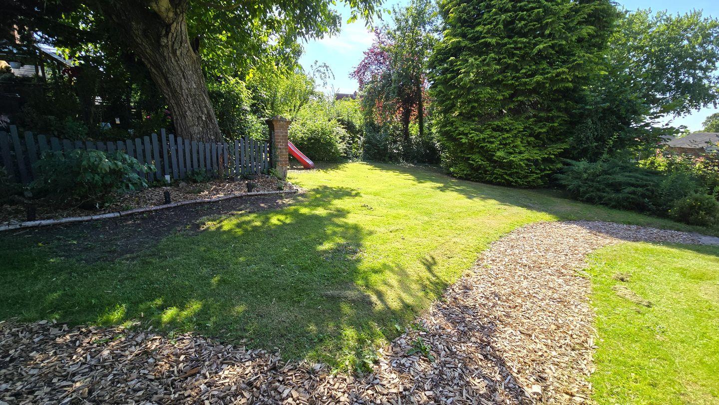 Garten: Tisch / 5 Stühle / offene Rasenfläche / Holzkohlegrill