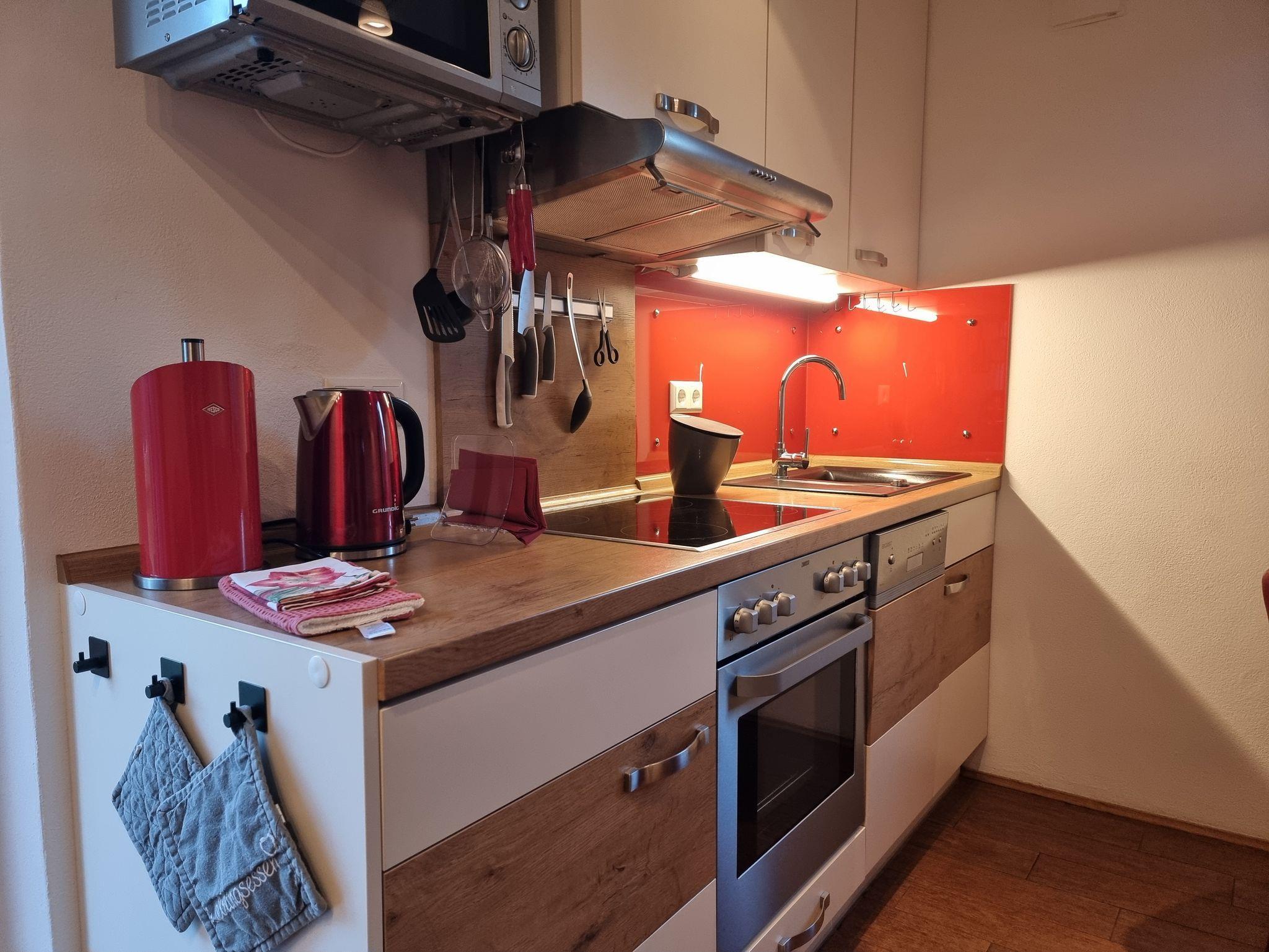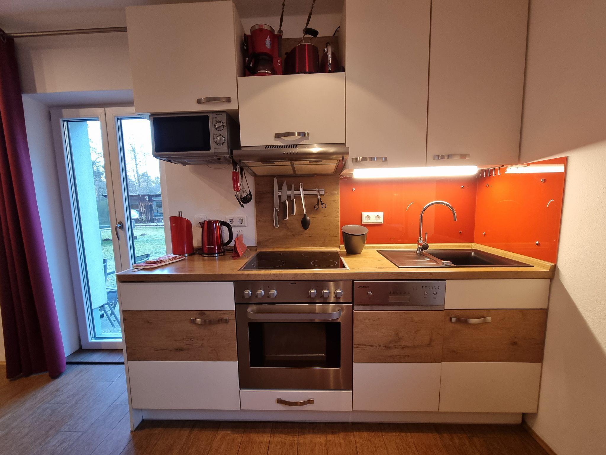 Die Wohnung hat ca. 41m² und besteht aus einem großen Schlafzimmer, einem Wohnbereich mit Küchenzeile und einem Bad. Im Wohnbereich befindet sich ein bequemes Ledersofa, das zu einem bequemen Bett aufgeklappt werden kann. Die Fußbodenheizung und die Lüftungsanlage schaffen ein angenehmes Raumklima.