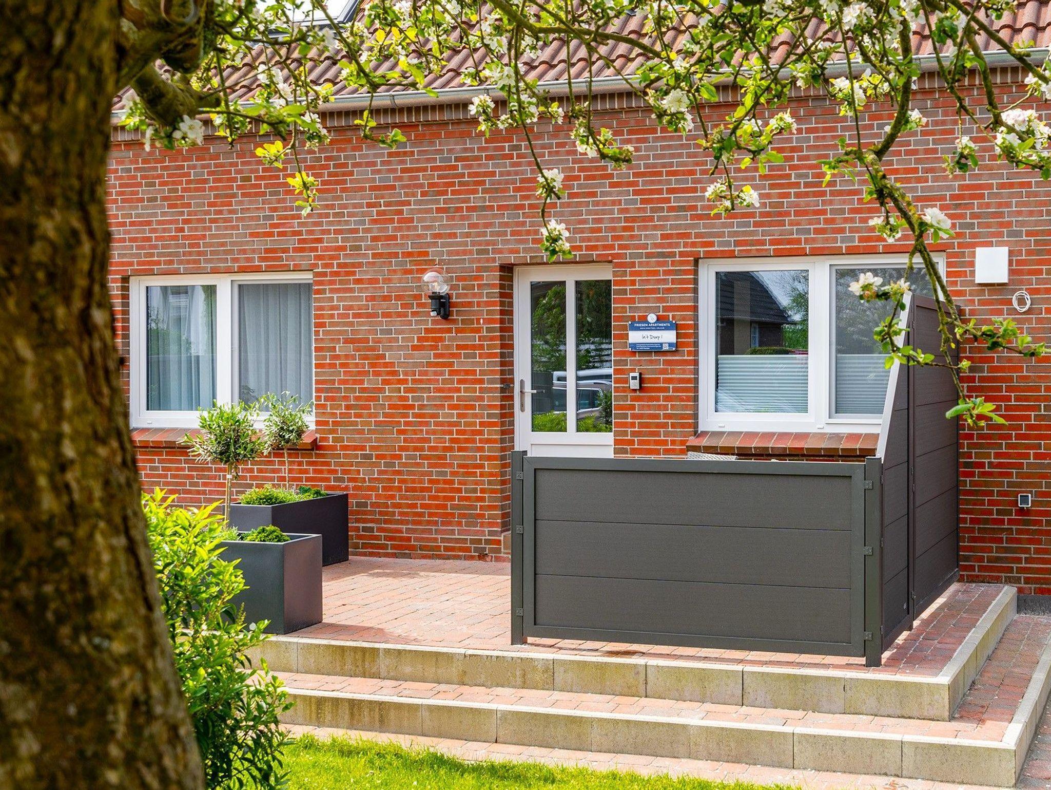 Zentral gelegene Erdgeschosswohnung in Greetsiel mit eigenem Garten, Terrasse und Parkplatz, ideal für ruhigen Urlaub nahe Hafen und Zwillingsmühlen.