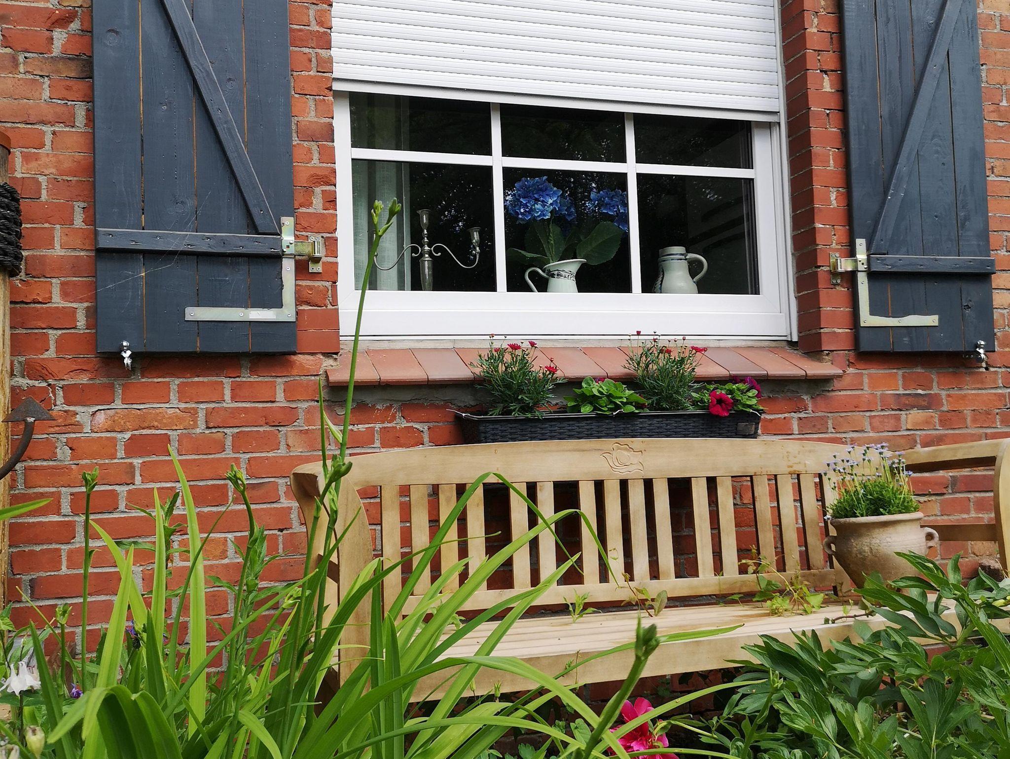 Im Garten haben wir ein massives Gartenhaus das ausgestattet ist mit einem Kaminofen, und einem Ostfriesensofa. Holz müssen sie sich vor Ort kaufen und können dann Abends auf dem Ostfriesensofa vor dem Kamin sitzen.