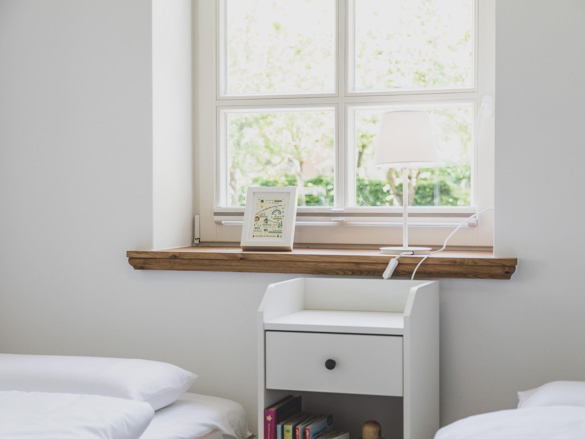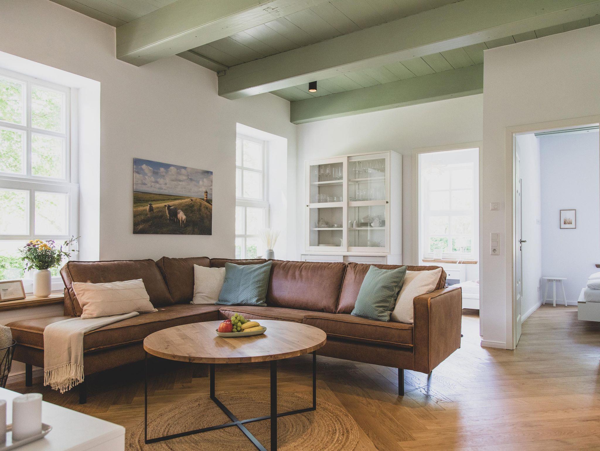 Unsere Wohnungen im Vorderhaus des Ferienhofs verfügen über hohe Decken mit durchgehend erhaltenen alten Deckenbalken. Die historischen Blockrahmenfenster und Fensterläden wurden in Handarbeit neu erstellt und runden den Anblick des denkmalgeschützten Gulfhofs ab. Im ehemaligen Scheunentrakt befinden sich durch bodentiefe Fenster helle und großzügig geschnittene Wohnungen. Alle Ferienwohnungen sind individuell, modern und mit viel Liebe zum Detail eingerichtet und bieten von der Terrasse einen erholsamen Blick auf die Grünflächen mit altem Baumbestand.