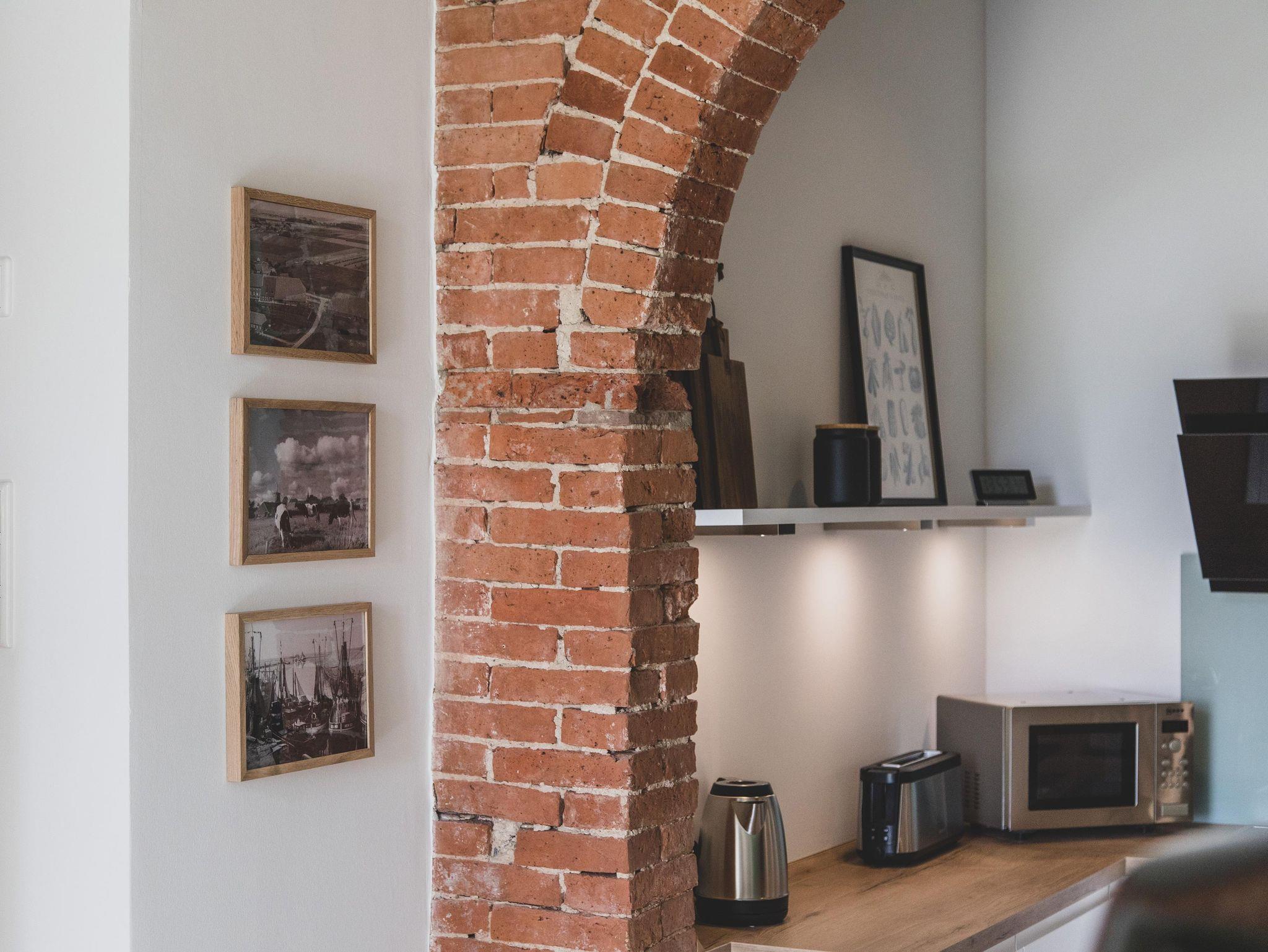 Hohe Decken, dicke Balken und die großen Sprossenfenster prägen das Erscheinungsbild der hellen Wohnung. Echtholzdielen, die moderne Einrichtung, ausgesuchte Details und Bilder runden den Charme der Wohnung ab.