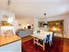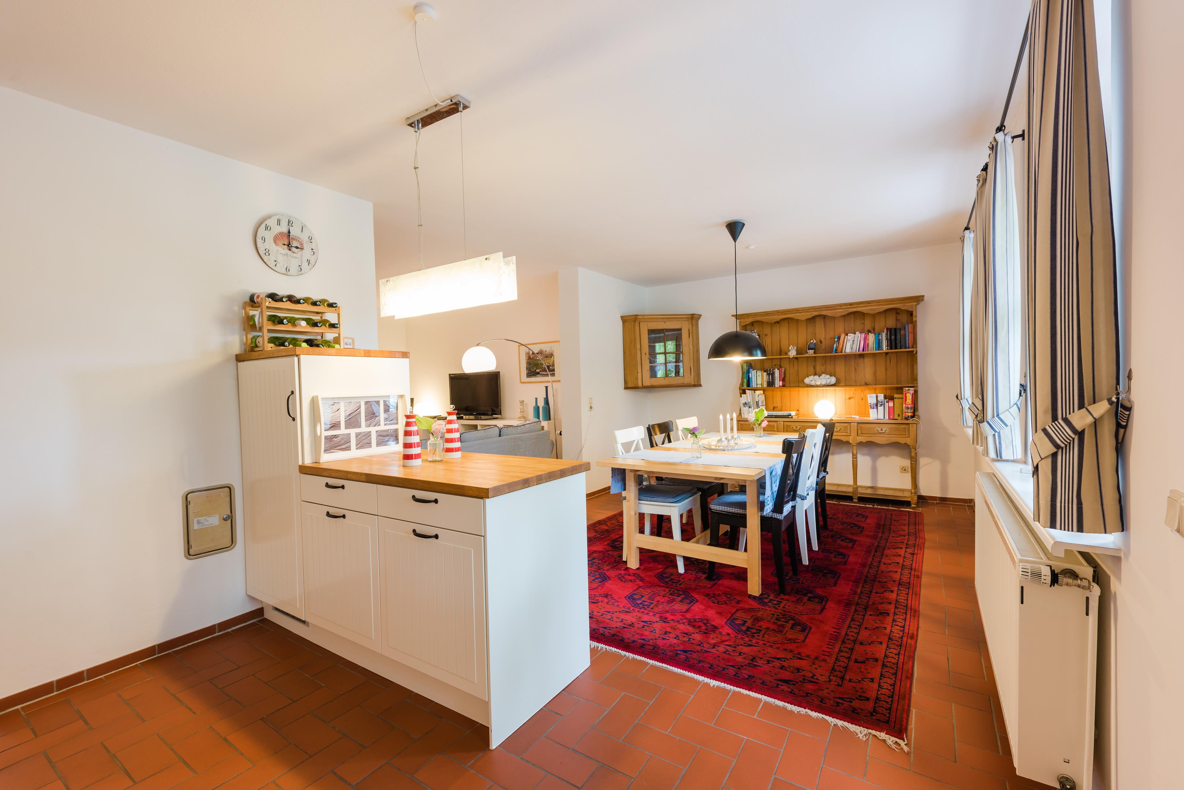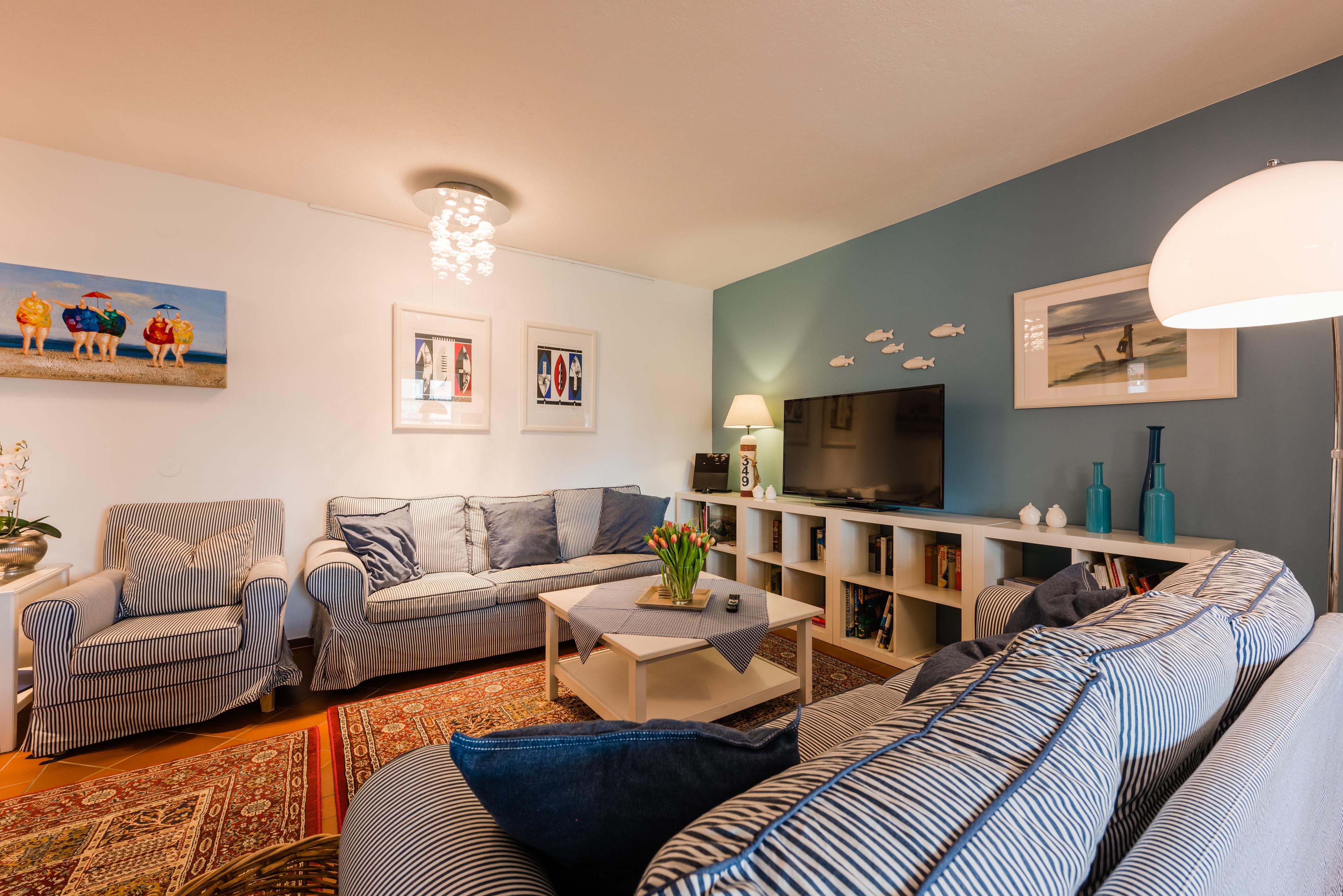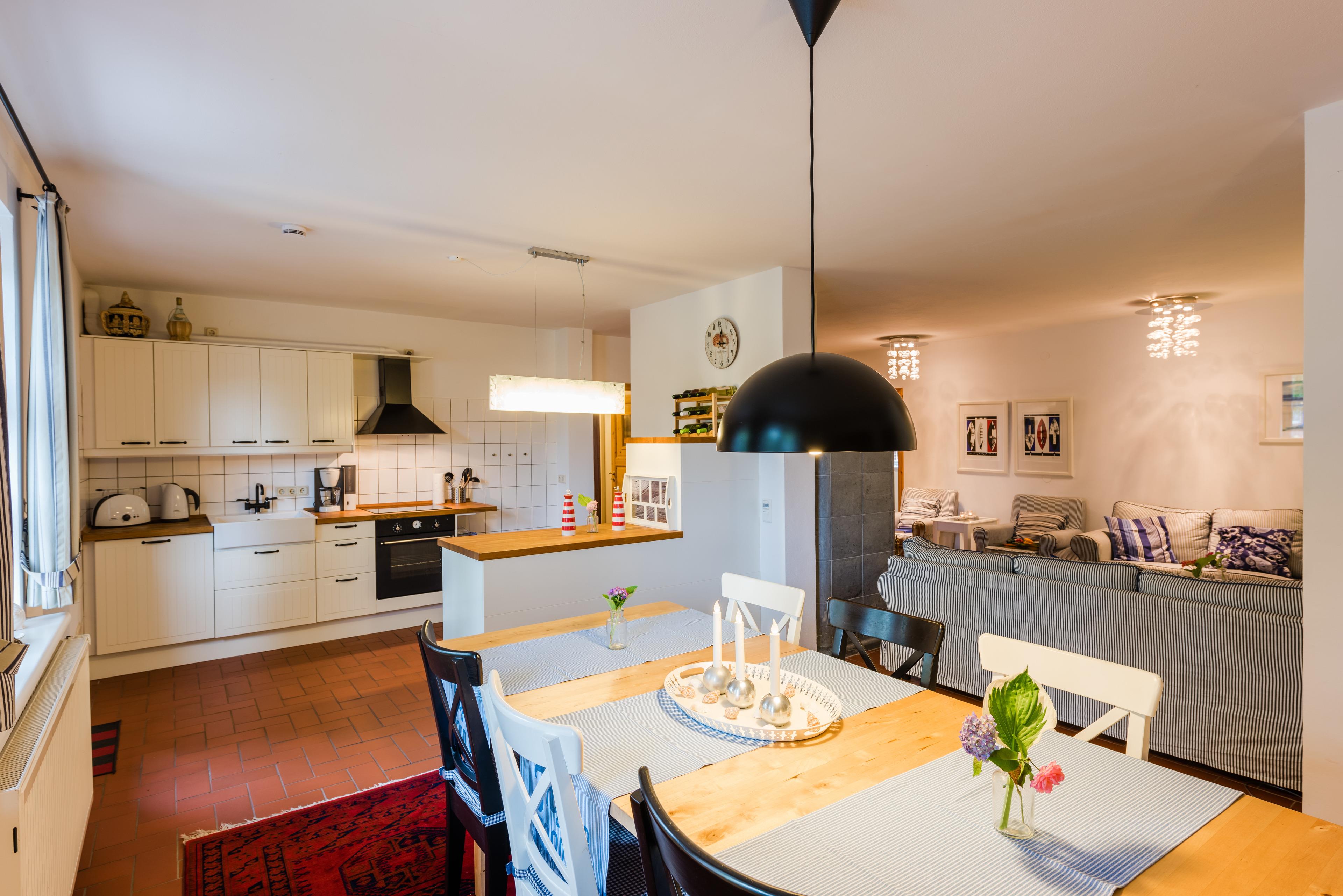 Die "Strandlust" ist mit 90 qm sehr geräumig. Die moderne Wohnung bietet mit ihrem Wohnzimmer in maritimen Farben und der offenen Landhausküche zum riesigen Essplatz weit mehr als viele andere Feriendomizile. Sie hat alles, was den Urlaub schöner macht. Es gibt zwei Doppelbett-Schlafzimmer. Das Badezimmer ist geräumig. Vor der Wohnung gibt es eine Terrasse. Sehr schön zu sitzen mit einem Glas Wein beim Sonnenuntergang. Hinter der Wohnung erstreckt sich der große Landhaus-Garten mit zig Sitz- und Liegeplätzen sowie Sonnenschirmen - zugänglich durch das Foyer des Hauses.