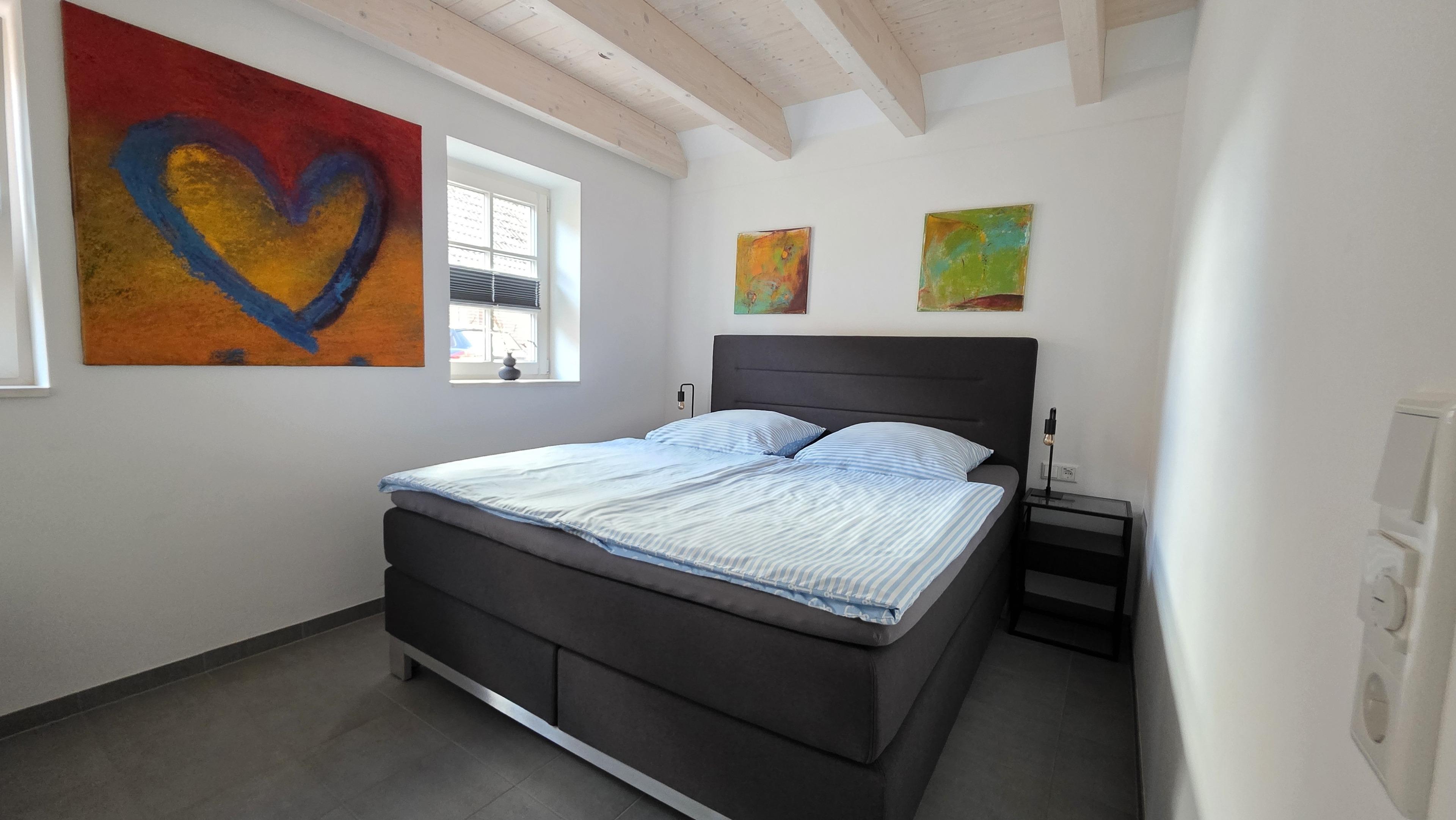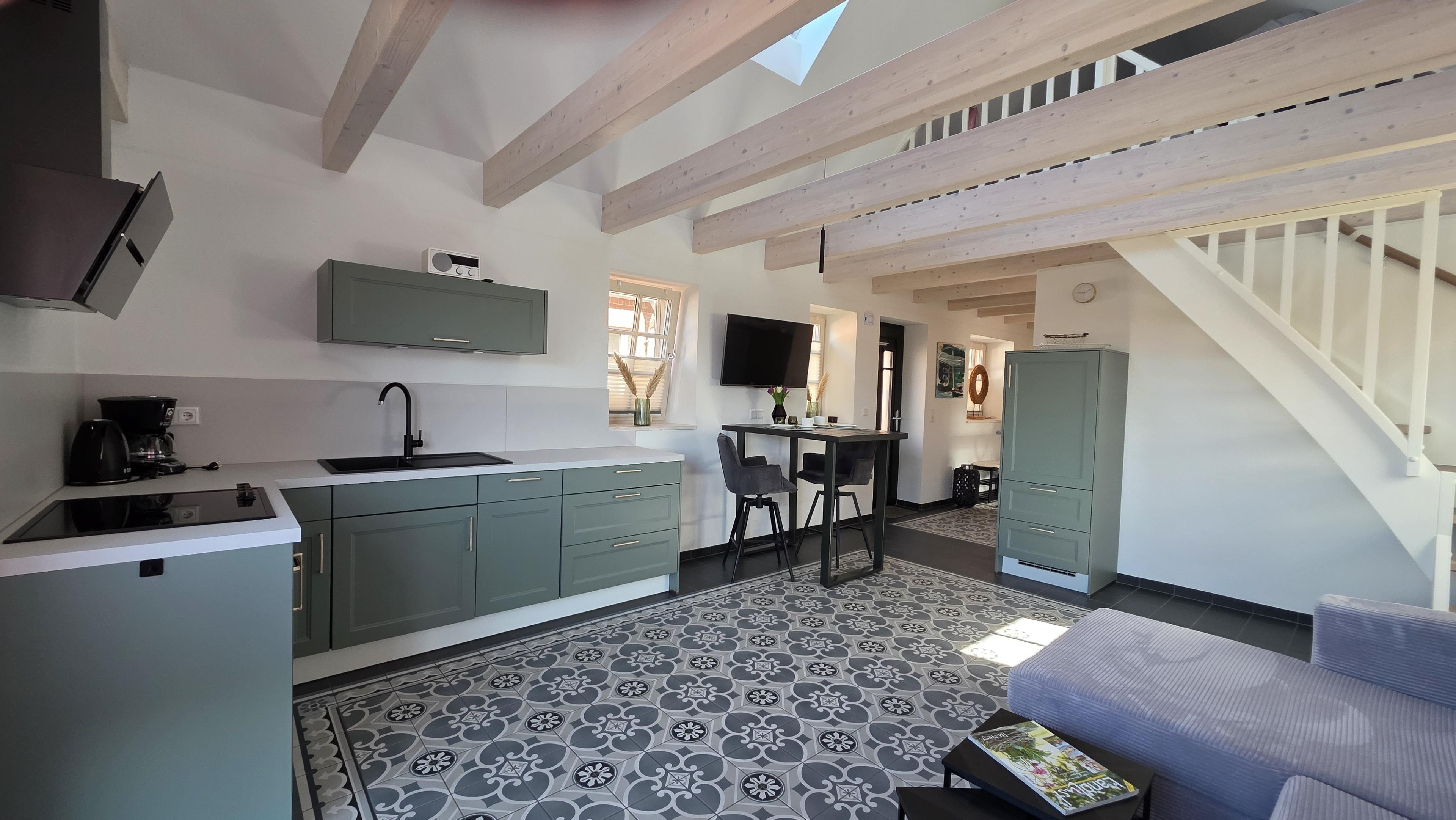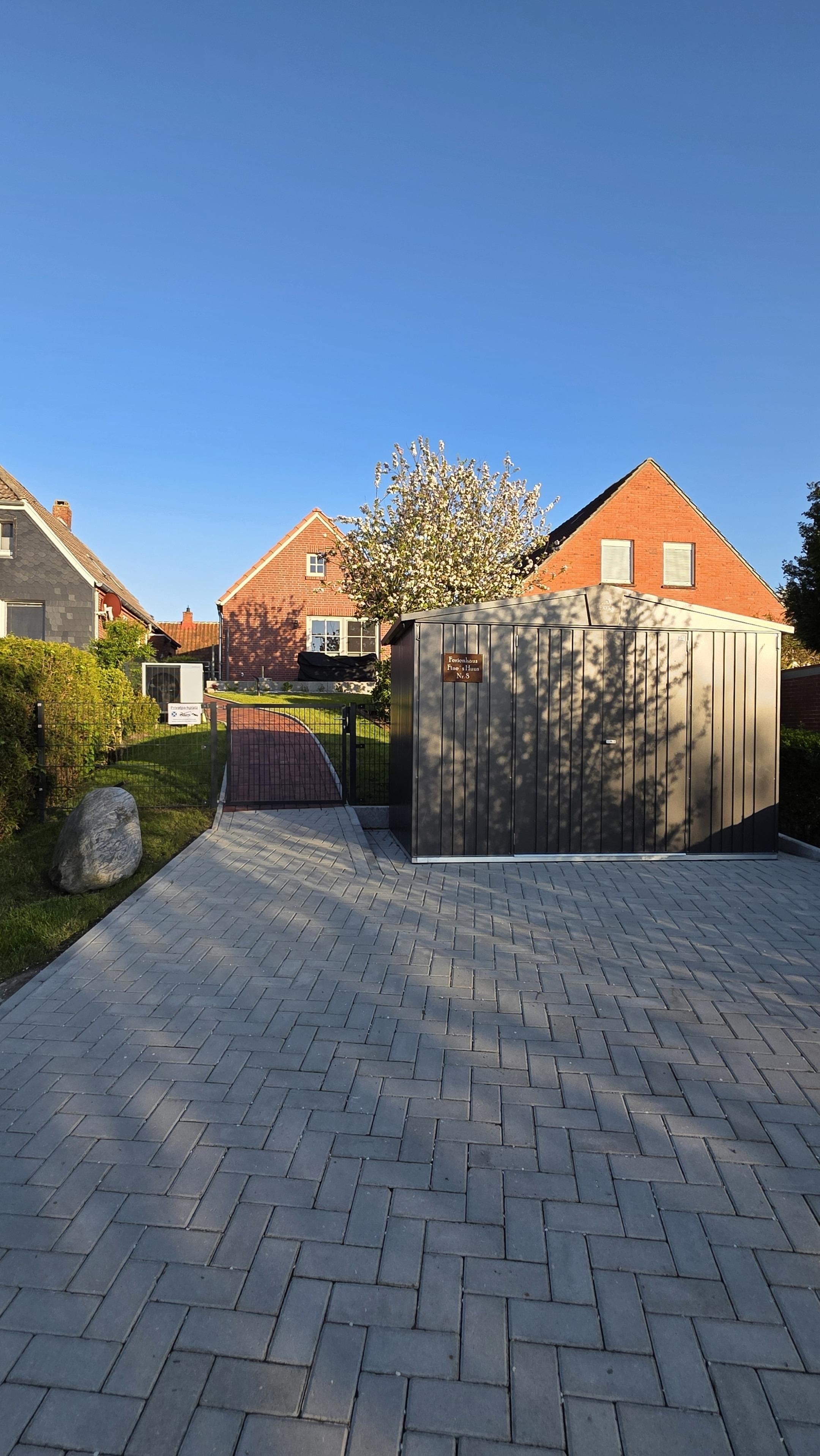 Die Ausstattung umfasst ein gemütliches Wohnzimmer, welches offen zur Küchenzeile gestaltet ist und eine praktische Sitzbar besitzt. Im Erdgeschoss befindet sich ein großzügiges Schlafzimmer mit einem komfortablen Boxspringbett (180 x 200 cm). Für Unterhaltung sorgen ein TV mit Wandhalterung sowie kostenfreies WLAN. Die voll ausgestattete Küche lässt keine Wünsche offen. Der lichtdurchflutete Wohnbereich bietet einen offenen Blick in den Giebel und lädt zum Verweilen ein. Für eine angenehme Atmosphäre sorgen Fußbodenheizung und eine moderne Wärmepumpe. Fliegengitter schützen vor ungebetenen Gästen, während das Badezimmer mit einer bequemen Walk-in-Dusche, WC und einem Handtuchwärmer ausgestattet ist. Im Obergeschoss befindet sich eine Galerie mit zwei Einzelbetten und freiem Blick in den Wohnraum. Die Sonnenterrasse lockt mit Seitenmarkisen, Sichtschutz und einer Lounge Sitzgruppe. Der eingezäunte Garten bietet Privatsphäre, ein PKW-Stellplatz ist vorhanden. Zusätzlich steht ein Gartenhaus zur Verfügung, in dem mitgebrachte Fahrräder sicher abgestellt und geladen werden können.