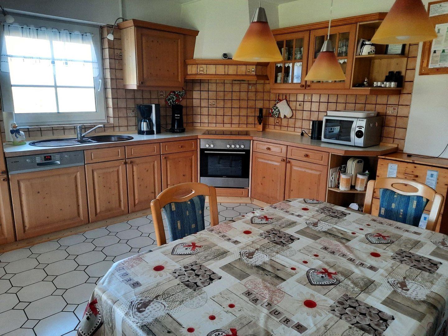 Das Schlafzimmer im Erdgeschoss ist mit einem gemütlichen Doppelboxspringbett und einem Kleiderschrank eingerichtet, sodass Sie sich nach einem erlebnisreichen Tag in aller Ruhe erholen können. Im Wohnzimmer erwartet Sie eine bequeme Polsterecke, ein Couchtisch, ein Sessel und ein TV. Für gesellige Stunden finden Sie hier auch eine Auswahl an Brett- und Kartenspielen. Ein kleiner Schreibtisch mit Bürostuhl bietet zudem Platz für etwaige Arbeitsaufgaben oder kreative Ideen. Die Küche ist komplett ausgestattet und lässt keine Wünsche offen. Hier finden Sie eine Eckbank, einen Tisch mit Stühlen, einen Kinderhochstuhl sowie alle nötigen Geräte wie eine Spülmaschine, einen Kühlschrank, einen Backofen, eine Mikrowelle und eine Kaffeemaschine. Geschirr für bis zu 16 Personen steht selbstverständlich zur Verfügung. Eine Balkontür führt Sie auf die überdachte Terrasse, die zu einer gemütlichen Liegewiese führt. Hier können Sie bei einem guten Buch oder einem Glas Wein entspannen. Der Gartentisch mit Stühlen und ein Holzkohlegrill sorgen dafür, dass Sie auch im Freien kulinarische Genüsse genießen können.