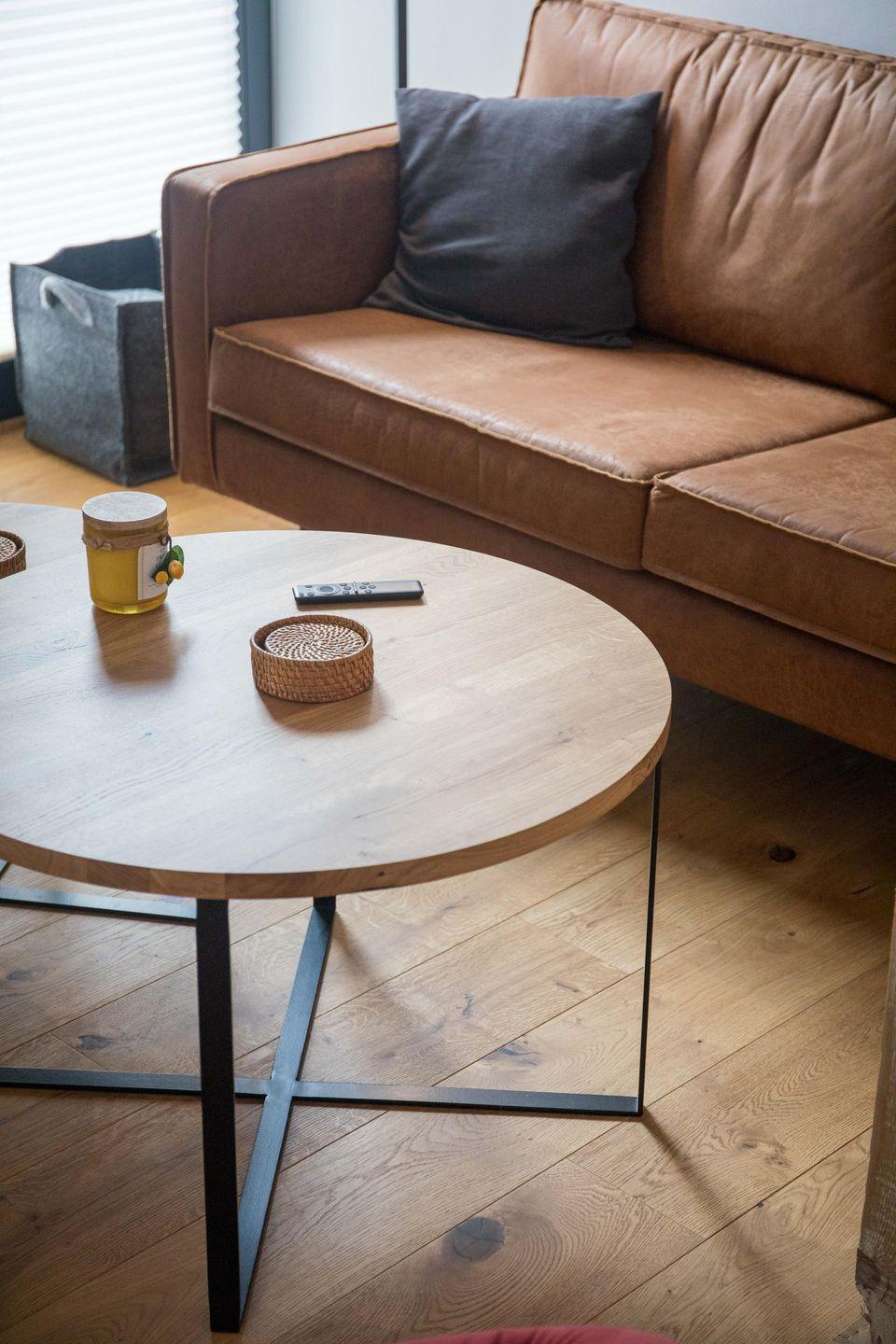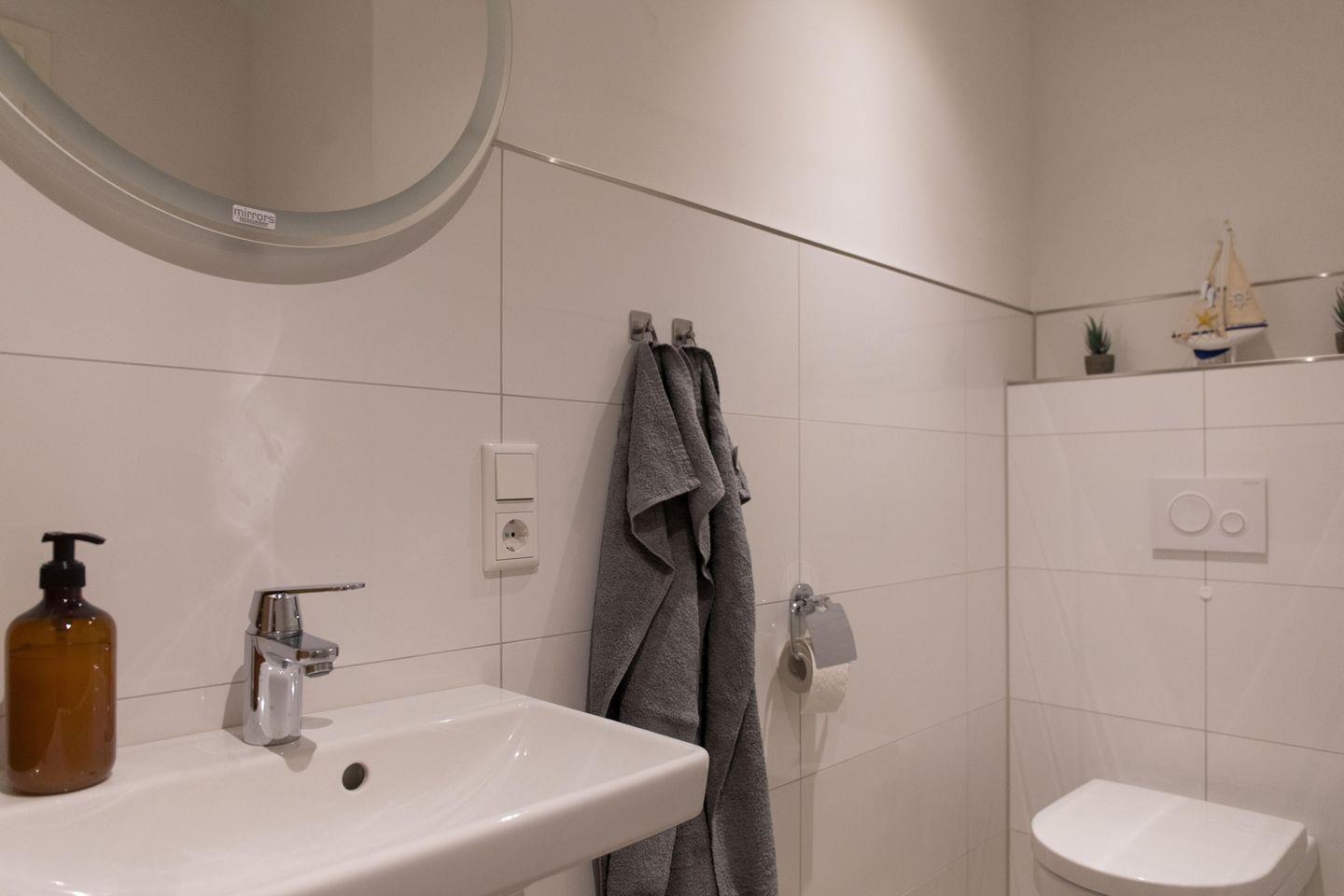 Von der Küche gelangt man in das großzügige Wohn- und Esszimmer. Genießen Sie gemeinsame Mahlzeiten im Essbereich oder entspannen Sie einfach auf dem bequemen Sofa im Wohnzimmer, während Sie den 50 Zoll großen QLED-Fernseher nutzen. Für die kleinen Gäste steht ein Kinderhochstuhl zur Verfügung. Für zusätzlichen Komfort sorgt die Fußbodenheizung, die für eine wohlige Atmosphäre selbst an kühlen Tagen sorgt. Zudem sind im Erdgeschoss ein Gäste-WC und ein Abstellraum vorhanden.