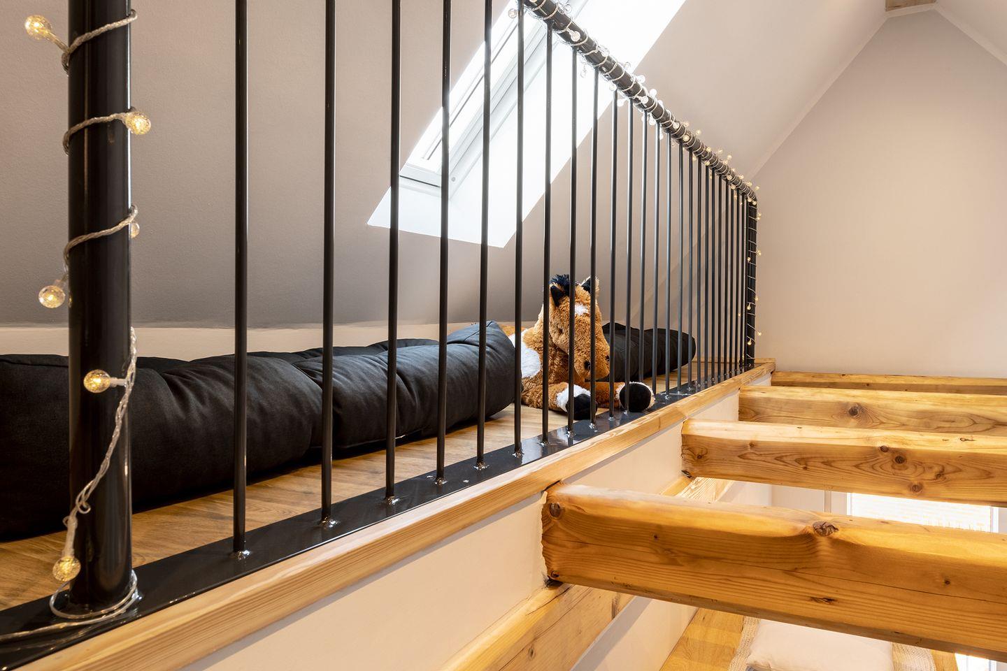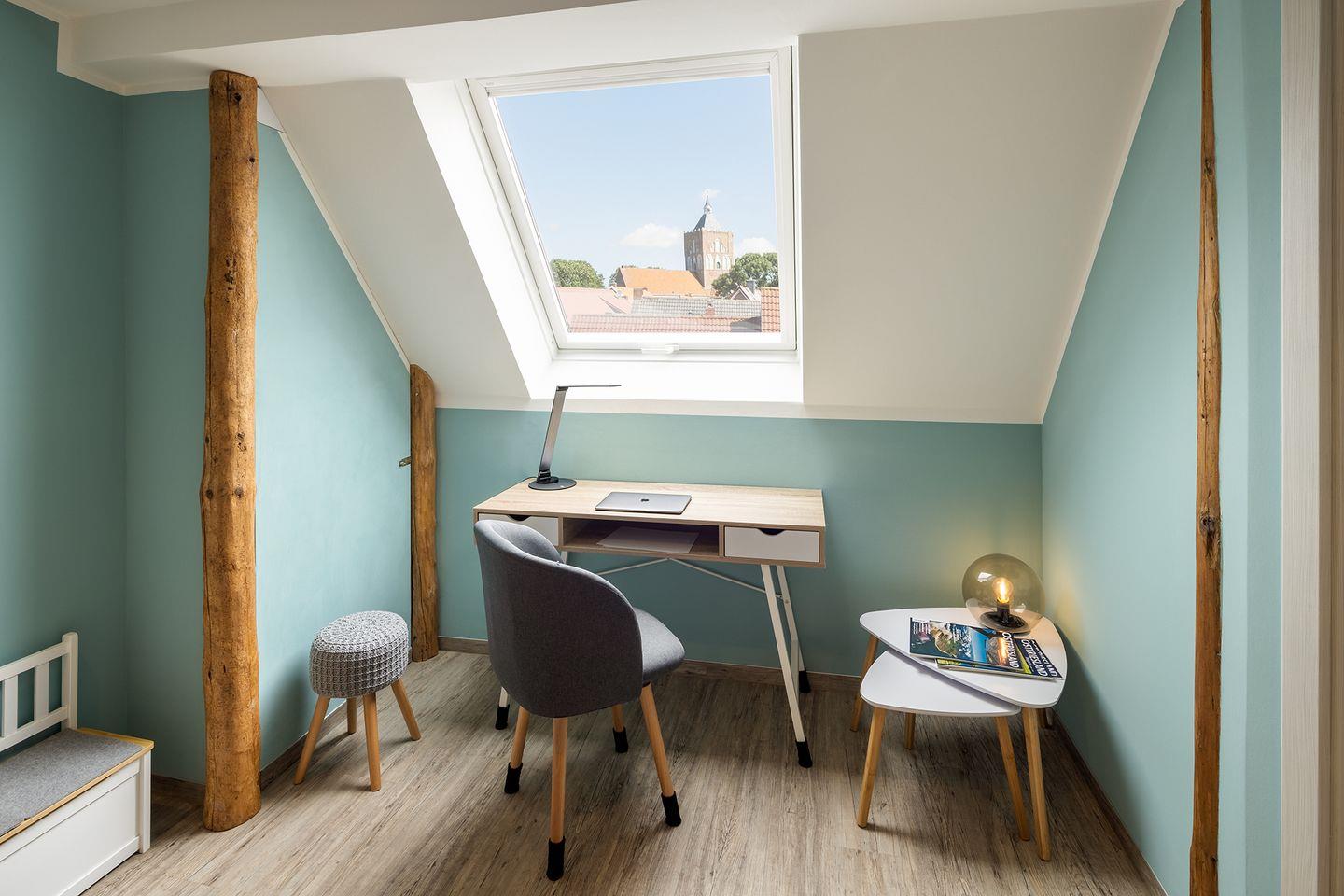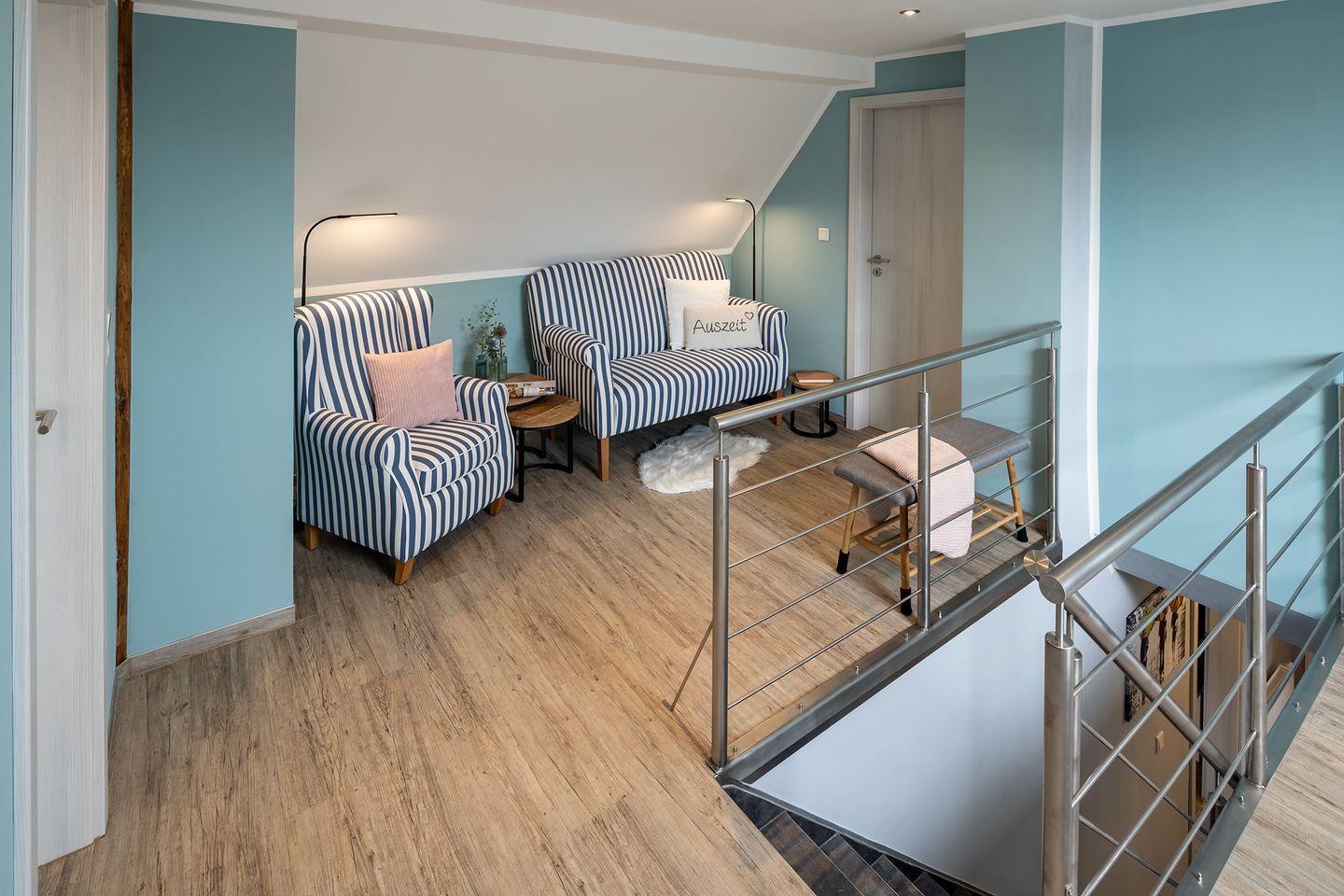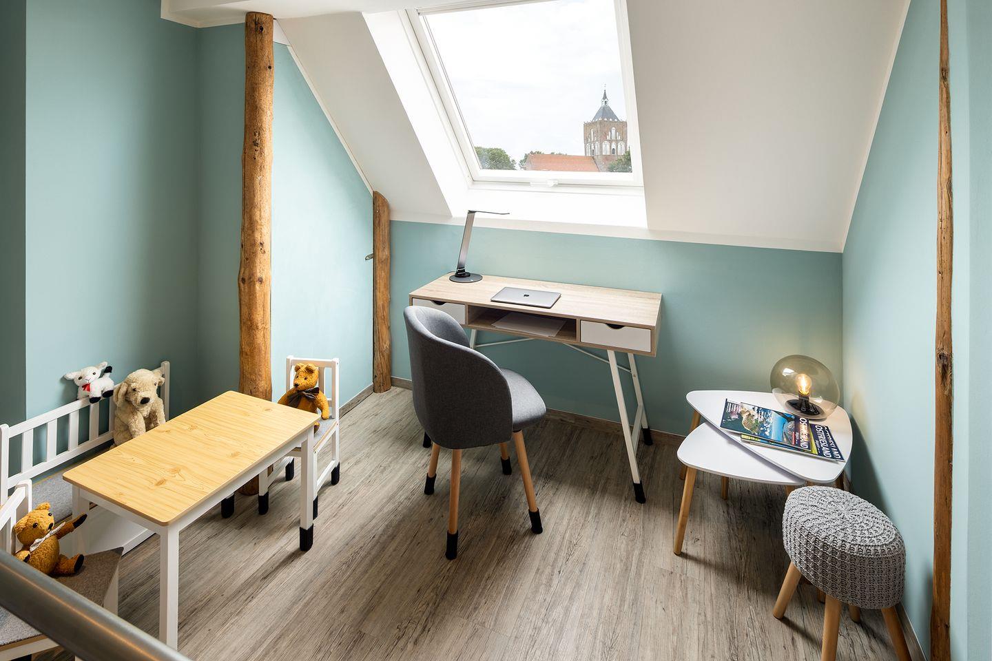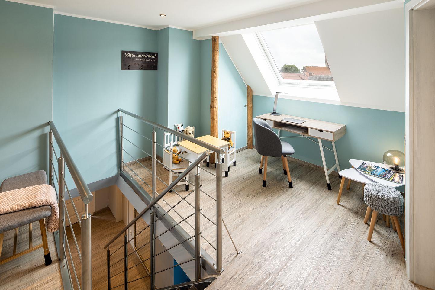Die Diele im Obergeschoss bietet einen Arbeitsplatz, Leseecke und Kinderecke.