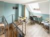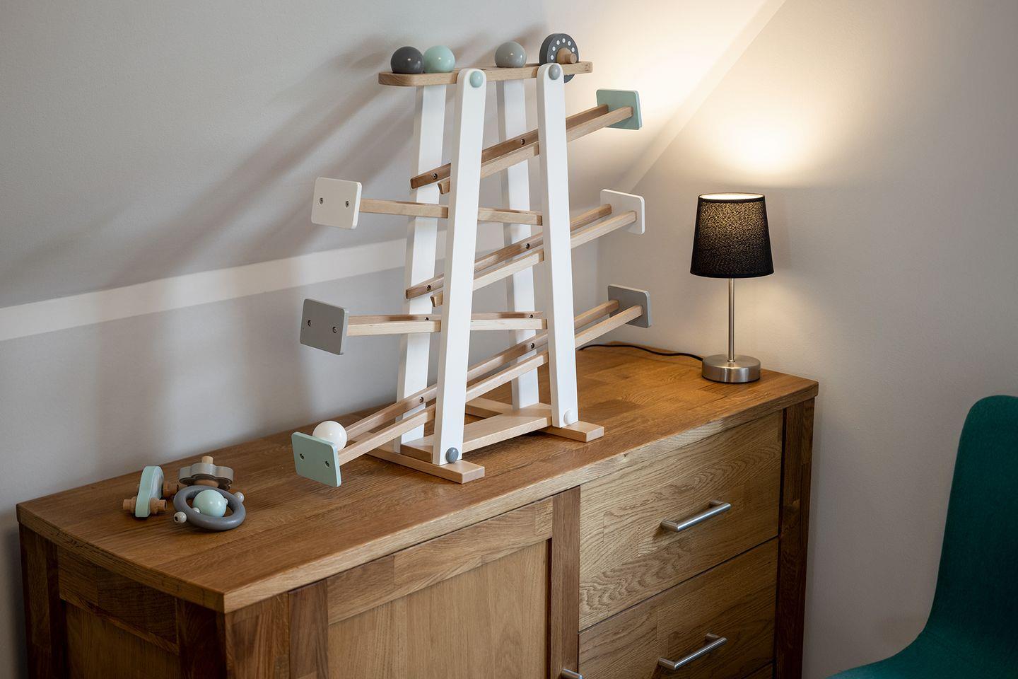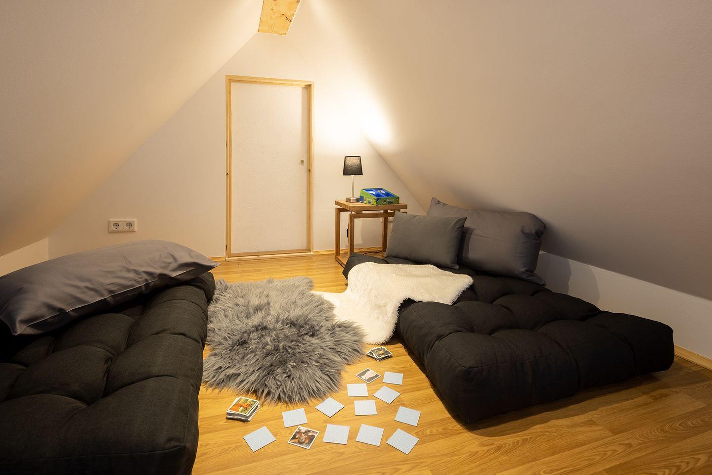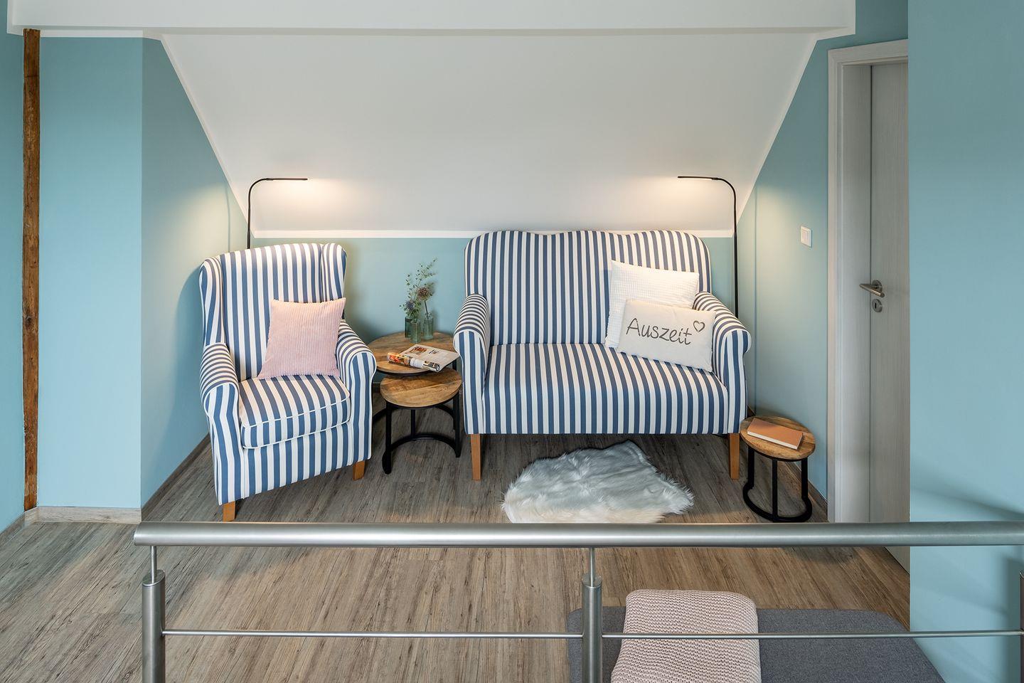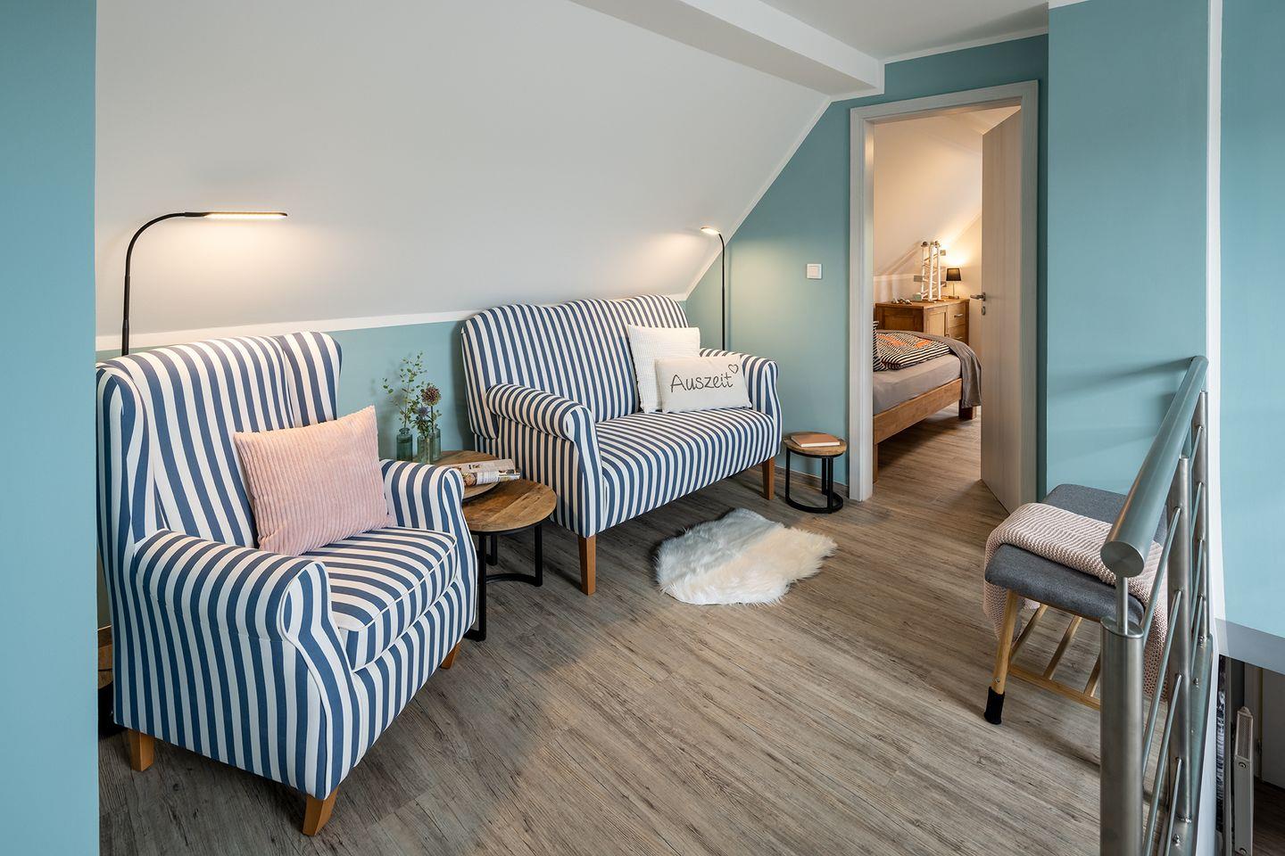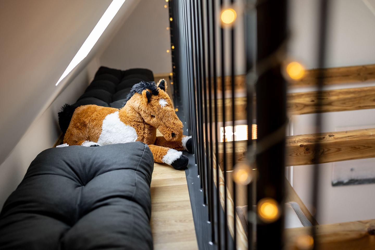 Die Diele im Obergeschoss bietet einen Arbeitsplatz, Leseecke und Kinderecke.